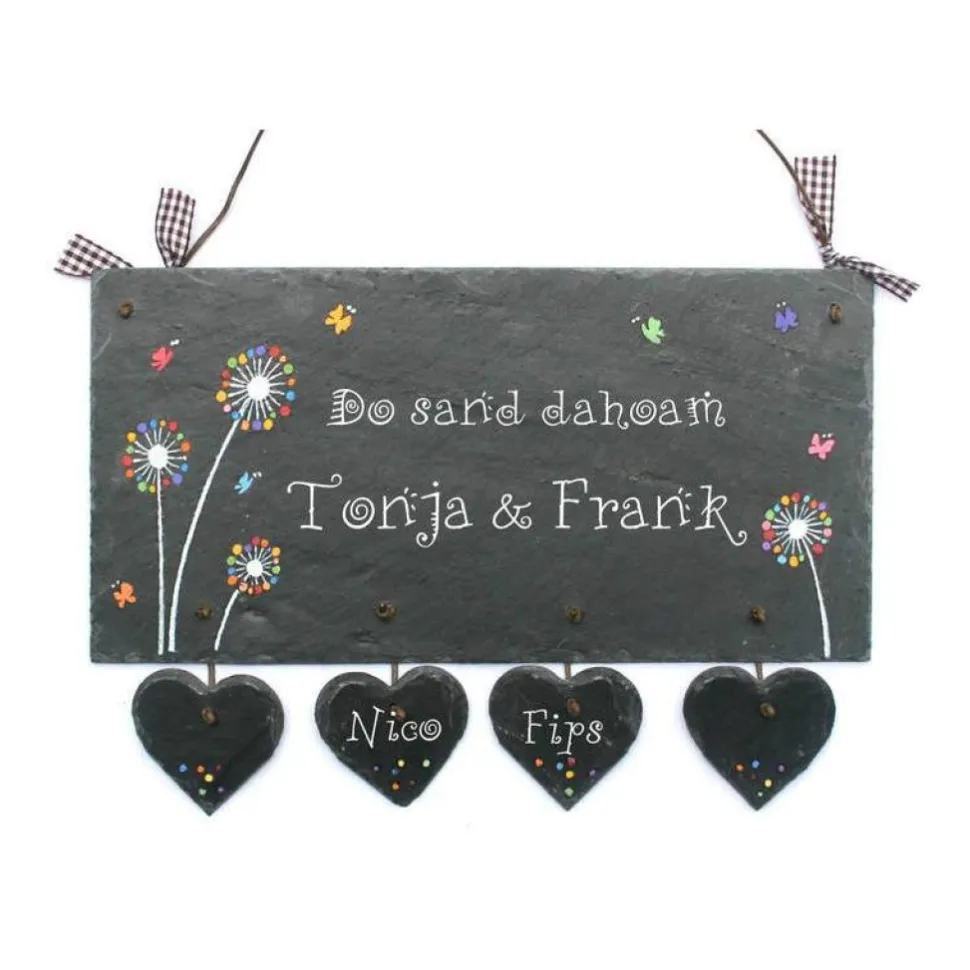 Entdecke ein einzigartiges, handgemachtes Schiefertürschild, das Du individuell personalisieren kannst! Dieses elegante Haustürschild aus Naturschiefer wird liebevoll gestaltet und ist mit floralen Motiven, Pusteblumen und fliegenden Schmetterlingen bemalt. Die 3 bis 6 Herzanhänger aus Schiefer werden mit Deinen Wunschnamen beschriftet und mit Elementen des Hauptschildes verziert. So wird Dein Schild zum unverwechselbaren Blickfang am Hauseingang.