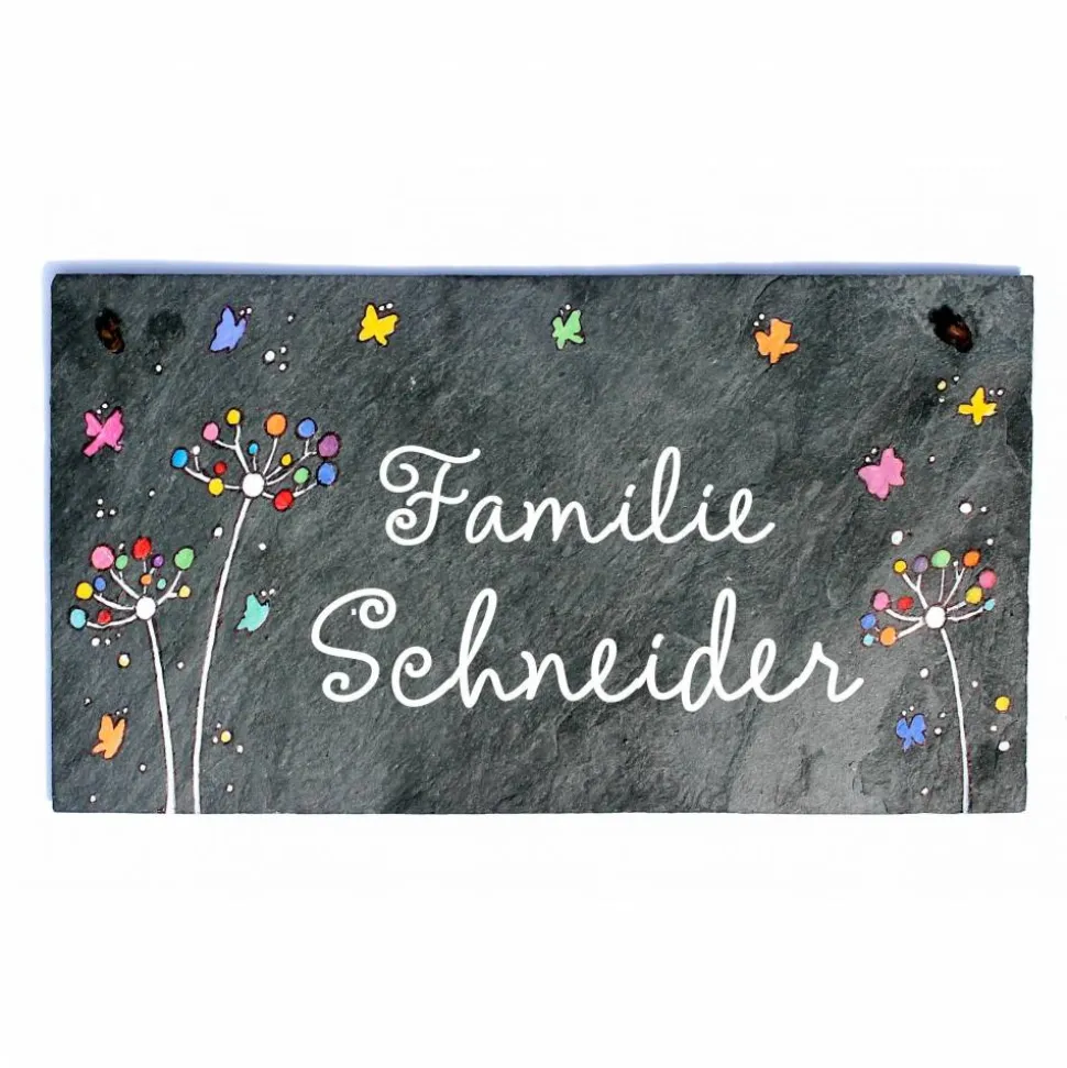 Mit seiner eleganten Optik und den handbemalten pastellfarbenen Pusteblumen links und rechts wird dieses Namensschild zu einer stilvollen Deko für deinen Innen- und Außenbereich. Mittig wird es zweizeilig in deiner Wunschschriftart mit „Familie“ und deinem Nachnamen beschriftet und abschließend mit bunten Schmetterlingen verziert. Du kannst wählen, ob der Familienname in weiß oder bunt gestaltet werden soll.