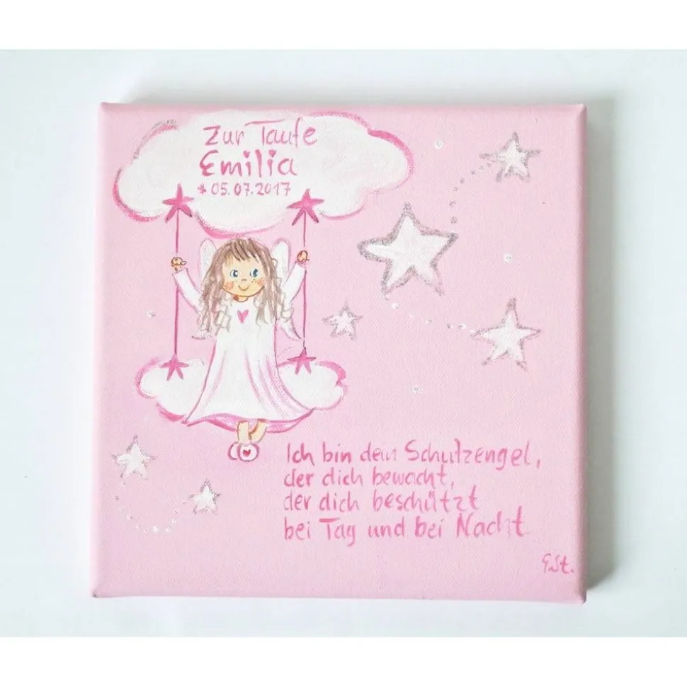 Ein liebevoll handgemaltes Schutzengelbild für Mädchen – individuell gestaltet auf einer Wolkenschaukel und gefertigt auf hochwertigem Keilrahmen. Mit den Maßen 20×20 cm ist dieses kleine Kunstwerk das perfekte Geschenk zur Taufe, zum Geburtstag oder zur Geburt.