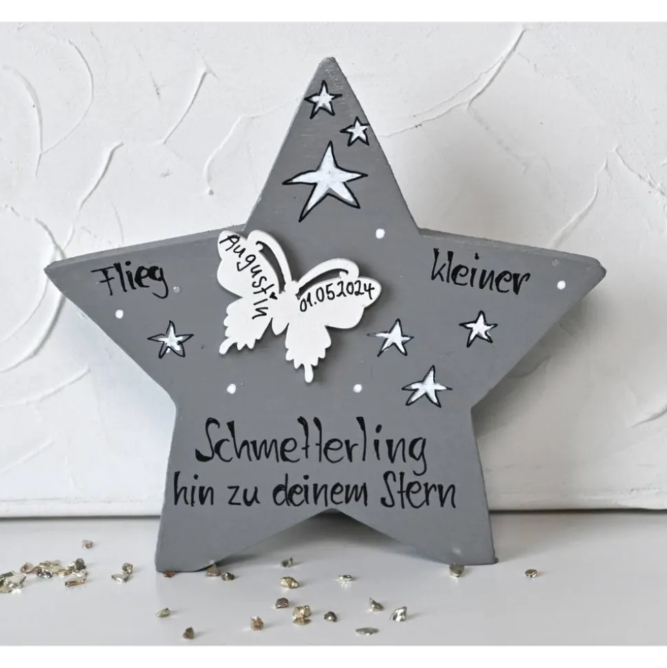 Jeder Holzstern wird mit hochwertiger Acrylfarbe in Ihrer Wunschfarbe grundiert und auf der Vorderseite von Hand bemalt und beschriftet. Der separat aufgeklebte Schmetterling trägt den Namen Ihres Sternenkindchens. Zum Schutz wird der Stern beidseitig mit Acryllack versiegelt.