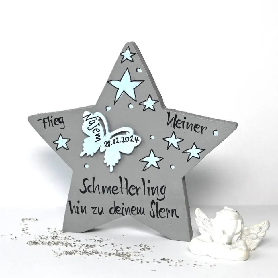 Der handbemalte Holzstern ist ein liebevolles Symbol für die ewige Verbindung zwischen Ihnen und Ihrem Sternenkind. Auch wenn Ihr Schmetterlingskind nicht mehr physisch bei Ihnen ist, bleibt die Erinnerung und Liebe für immer lebendig. Der Stern erinnert Sie daran, dass Ihr Sternenkind immer einen besonderen Platz in Ihrem Herzen und Ihren Gedanken hat.