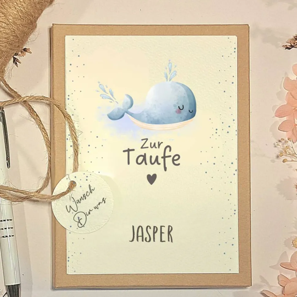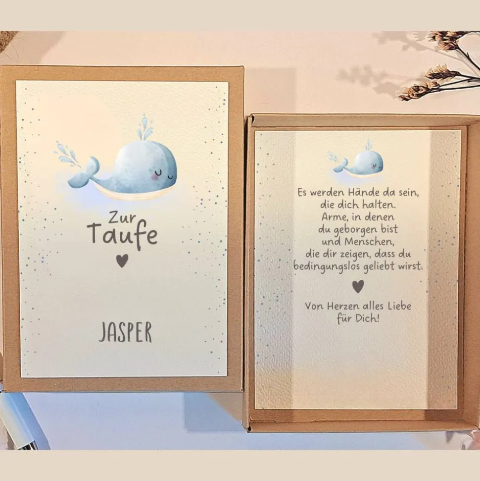 Suchst du ein besonderes Taufgeschenk? Mit unserer personalisierten Geschenkbox zur Taufe mit süßem Wal-Motiv machst du den besonderen Tag unvergesslich! Diese hochwertige Box wird individuell mit dem Wunschnamen des Kindes auf dem Deckel gestaltet und ist das perfekte Geldgeschenk – egal ob für einen Jungen oder ein Mädchen.