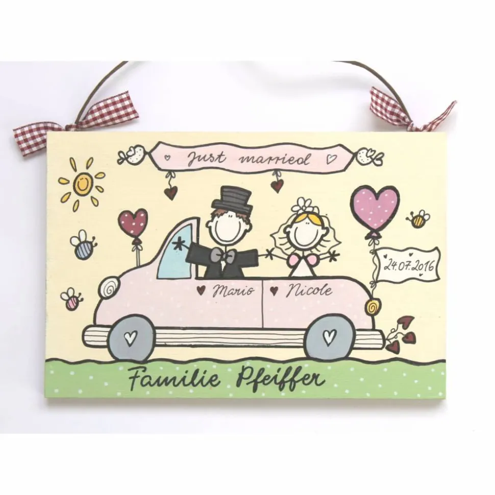 Überrasche das Brautpaar mit einem einzigartigen, personalisierten Hochzeitsgeschenk! Dieses liebevoll handbemalte Türschild aus Holz wird in beige grundiert und ist ein exklusives Unikat. Auf dem oberen Banner steht der Schriftzug „Just married“, darunter ein detailverliebt gemaltes Auto mit Braut und Bräutigam als Figuren.