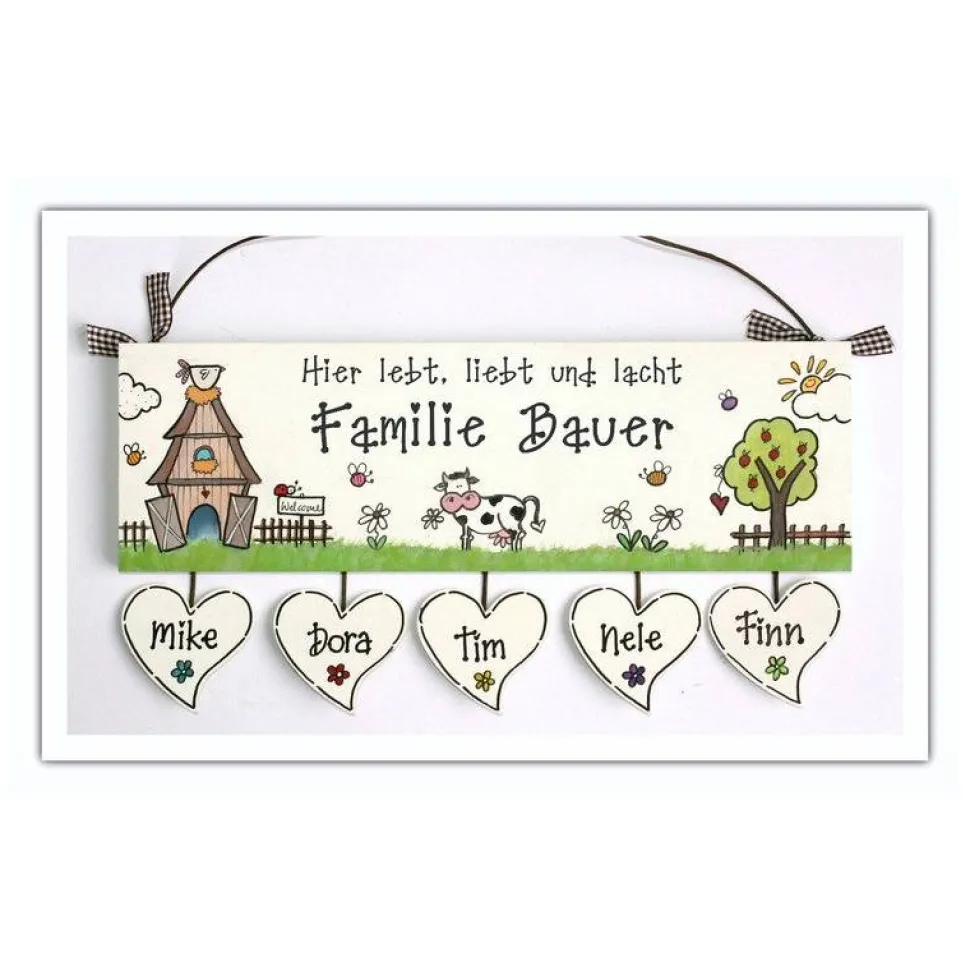 Verleihe Deinem Zuhause eine persönliche Note mit einem exklusiven Türschild aus Holz! Dieses hochwertige, handgefertigte Holztürschild ist das perfekte Willkommensschild für Deine Familie. Gefertigt aus wetterfestem Naturholz, wird das Schild individuell mit Deinem Familiennamen und bis zu sechs Herzanhängern, beschriftet mit den gewünschten Vornamen, gestaltet. Die Maße betragen 12,5 x 40 cm und eine praktische Aufhängekordel ist bereits angebracht.