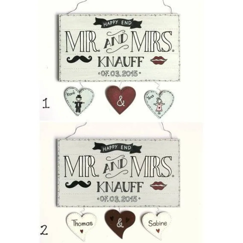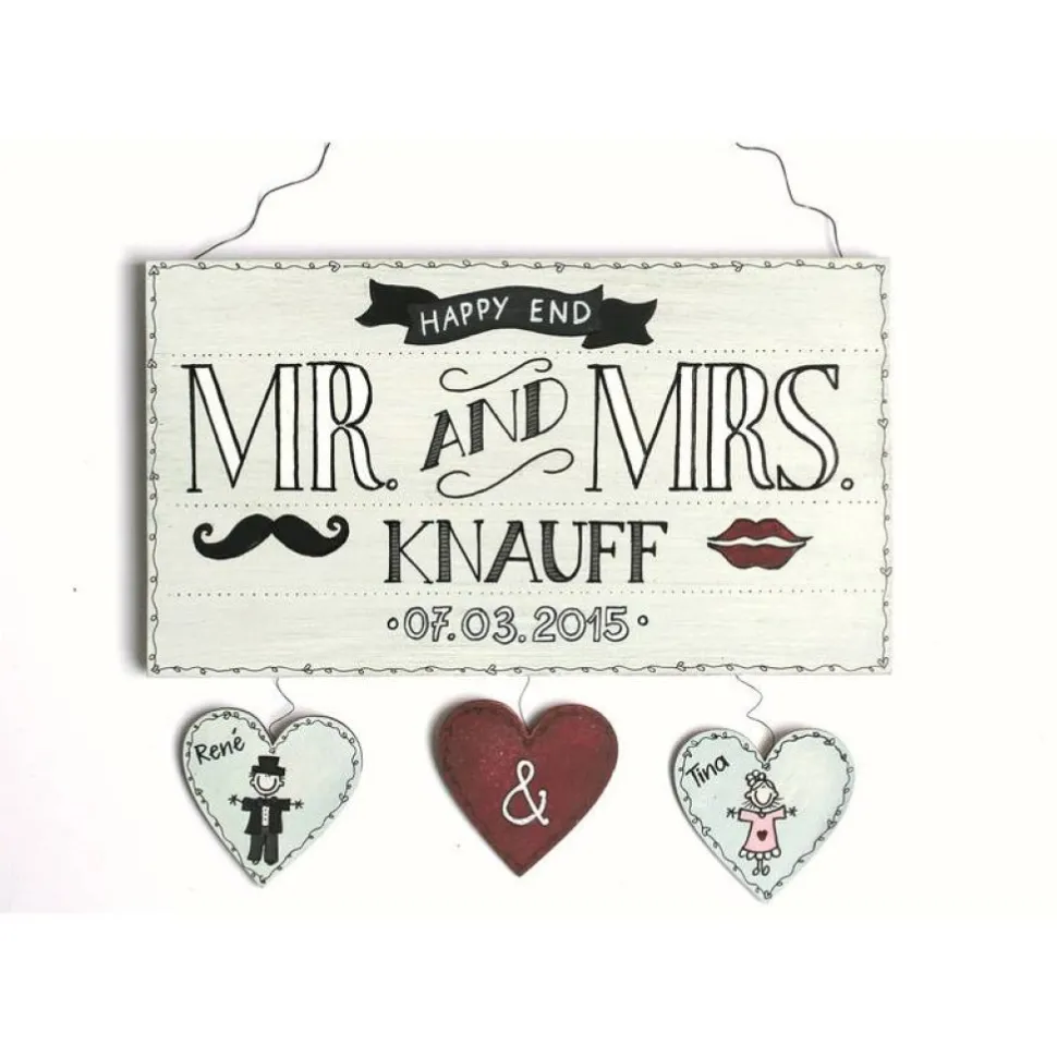 Das hochwertige Schild wird individuell mit dem Nachnamen, den Vornamen und dem Hochzeitsdatum des Paares gestaltet. Der obere Bereich ist in Grau gehalten und mit dem Banner „Happy End“ bemalt. Darunter steht MR. AND MRS. mit Bart und Kussmund, darunter der Nachname in Großbuchstaben und das Hochzeitsdatum.