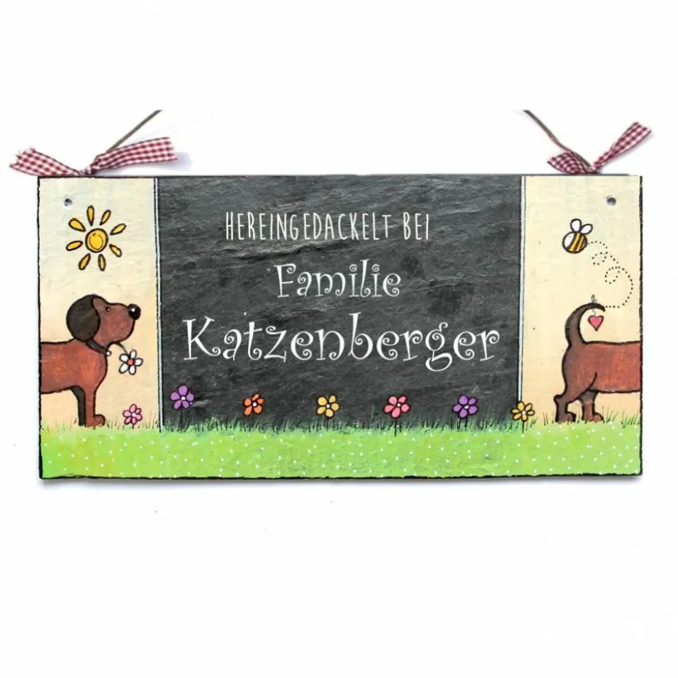 Das wetterfeste Schieferschild überzeugt durch elegante Optik und eignet sich perfekt als stilvolle Deko für Innen und Außen. Links und rechts bunt bemalt mit Hund, in der Mitte dreizeilig mit deinem Wunschtext – jedes Schild ist ein echtes Unikat und wird zum besonderen Highlight an deiner Haustür.