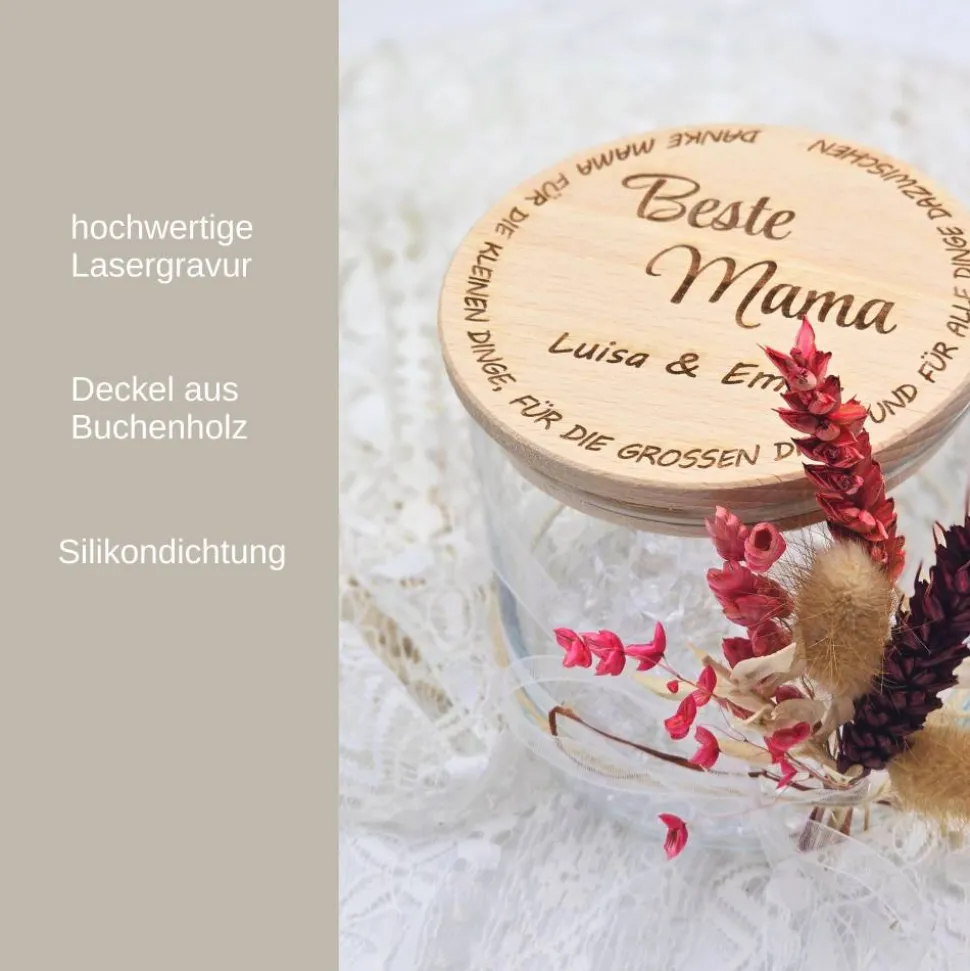 Überrasche deine Liebsten mit einem personalisierten Vorratsglas, das sich perfekt als Geschenk für Mama, Papa, Großeltern oder als kleines Dankeschön eignet. Dieses stilvolle und praktische Glas kann individuell mit Namen des Kindes / der Kinder / Enkel graviert werden. Ob für die beste Mama, den besten Papa oder die lieben Großeltern – dieses personalisierte Vorratsglas ist nicht nur ein Blickfang in jeder Küche, sondern auch ein Zeichen der Wertschätzung und Liebe. Ideal zum Aufbewahren von Keksen, Nüssen, Süßigkeiten oder anderen Kleinigkeiten. Ein einzigartiges und persönliches Geschenk, das garantiert Freude bereitet!