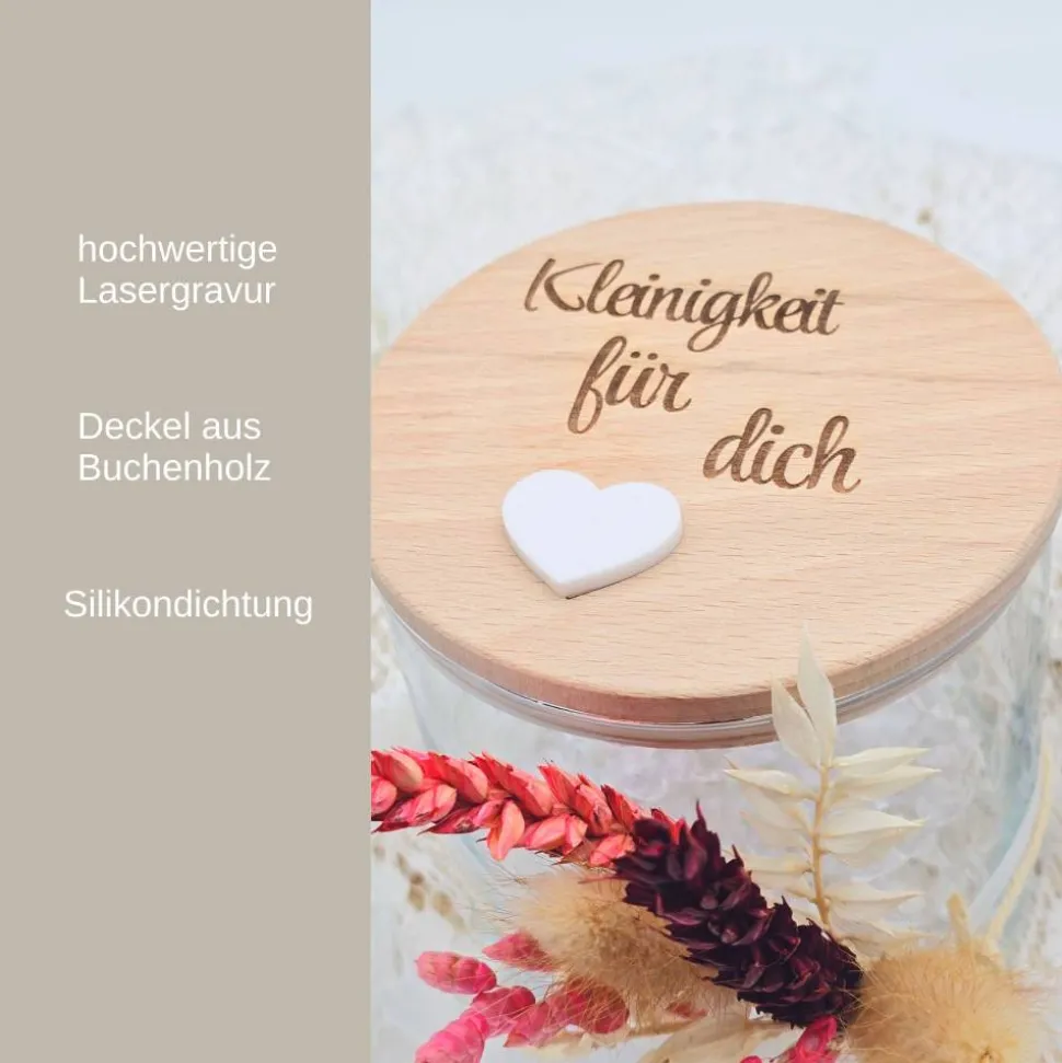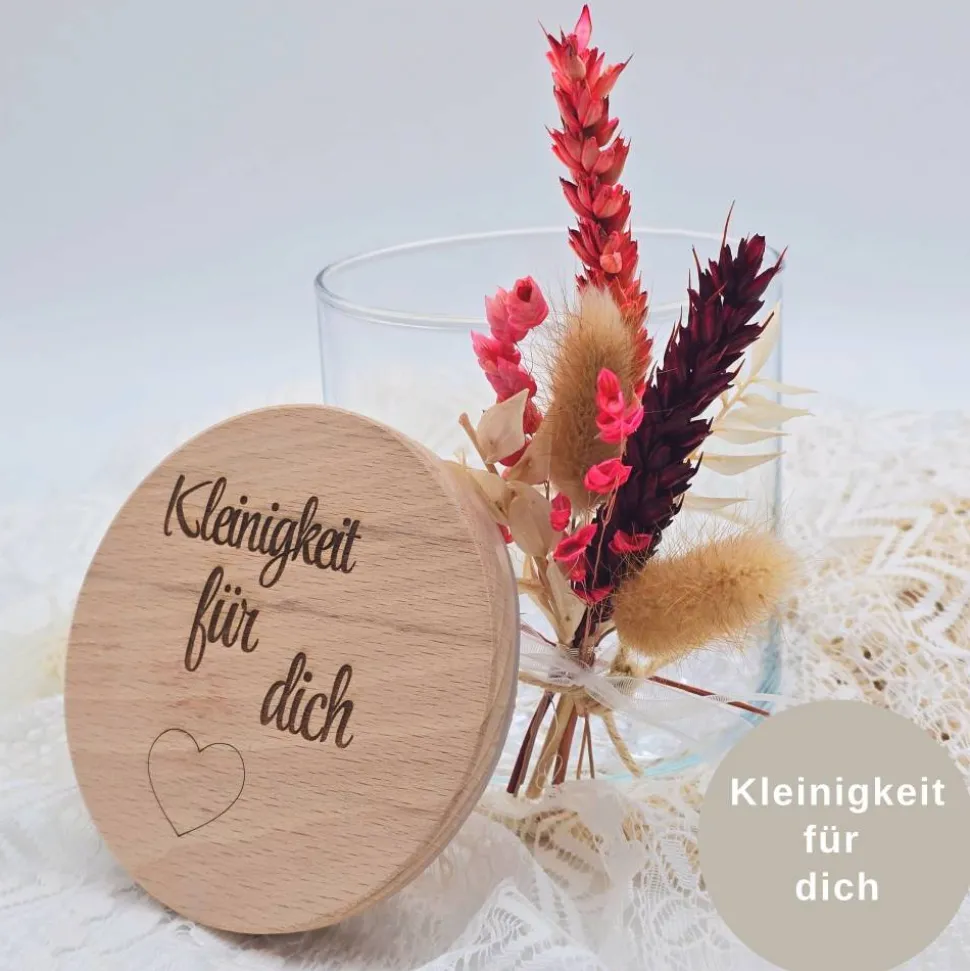 Unser personalisiertes Vorratsglas mit Trockenblumenstrauß ist das perfekte kleine Dankeschön für Mama, beste Freundin sowie ein wunderschönes Abschiedsgeschenk für den Kindergarten sowie Schule! Dieses Vorratsglas besticht nicht nur durch seine Funktionalität, sondern auch durch seine persönliche Note. Es wird mit einem kleinen Trockenblumenstrauß geliefert. Das Glas kann individuell mit einem Namen oder einer kurzen Botschaft graviert werden und eignet sich hervorragend für die Aufbewahrung von Süßigkeiten, Tees oder anderen kleinen Schätzen. Ideal als Geschenk für Erzieher:innen, Lehrer:innen oder als kleines Dankeschön für Mama und Papa. Hergestellt aus hochwertigem Glas und versehen mit einem luftdichten Verschluss, hält dieses Vorratsglas deine Inhalte frisch und sicher. Der liebevoll gestaltete Trockenblumenstrauß fügt eine extra Schicht an Persönlichkeit und Charme hinzu.
