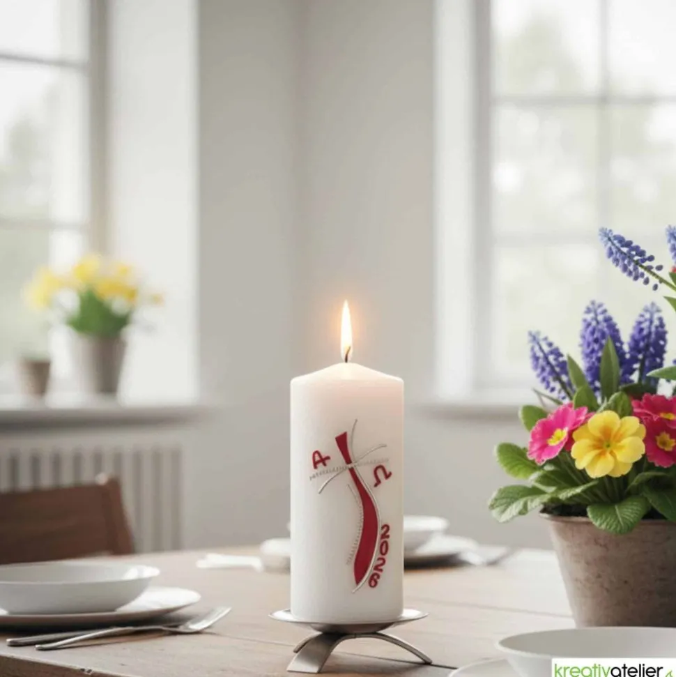 Die festliche christliche Osterkerze mit rotem Kreuz, strahlender Sonne, Alpha und Omega ist ein Kunstwerk, das die Schönheit und Bedeutung des Osterfestes zum Ausdruck bringt. Das rote Kreuz steht für das Leiden und den Tod Jesu, während die strahlende Sonne dessen Auferstehung symbolisiert und die Hoffnung auf ein ewiges Leben verkörpert. Alpha und Omega sind die ersten und letzten Buchstaben des griechischen Alphabets und stehen für den Anfang und das Ende, den Beginn eines neuen Lebens. Diese Kerze ist eine wunderbare Möglichkeit, das Osterfest zu feiern und die Bedeutung dieses wichtigen Ereignisses zu ehren.