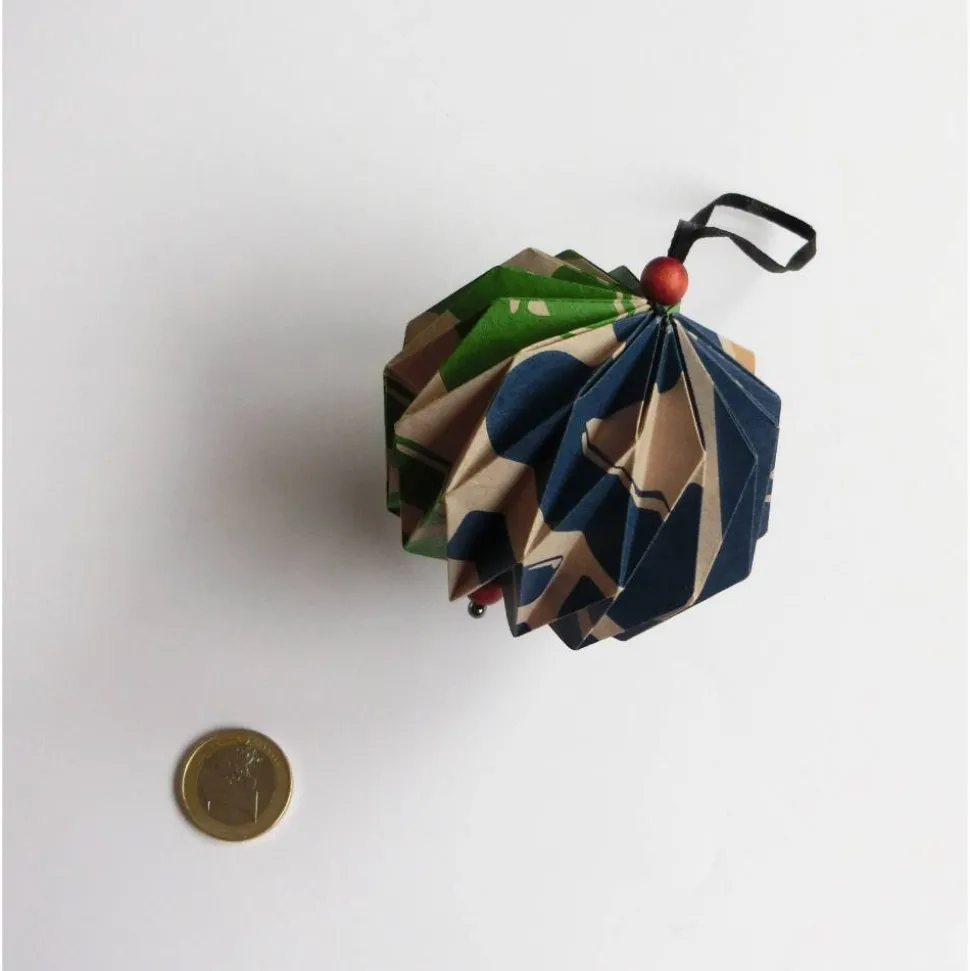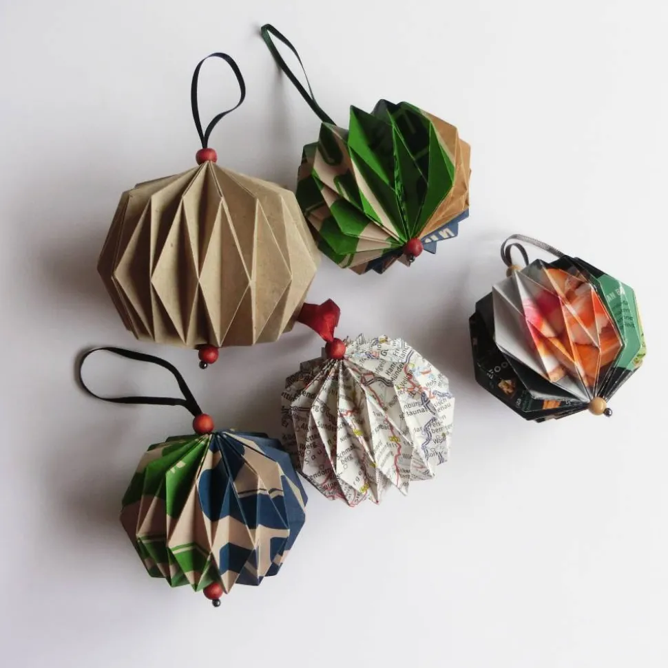 Die Weihnachtskugeln eignen sich als Baumschmuck oder fürs Fenster oder den Raum. Sie bestehen aus verschiedenem Upcycling-Papier wie Packpapier, Papiereinkaufstüten, Landkarten oder Flyern