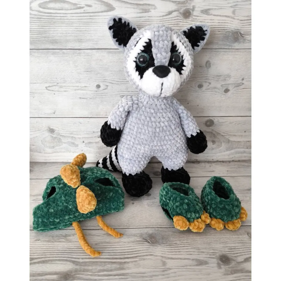 Raffi ist ein etwa 31 cm großer, handgemachter Plüsch-Waschbär – ein echter kleiner Abenteurer mit Herz! Er trägt eine abnehmbare Drachenmütze und grüne Stiefel, die ihm einen ganz besonderen Look verleihen. Egal ob mit oder ohne Kostüm – Raffi ist immer bereit für Spiel, Fantasie und viele Kuscheleinheiten.