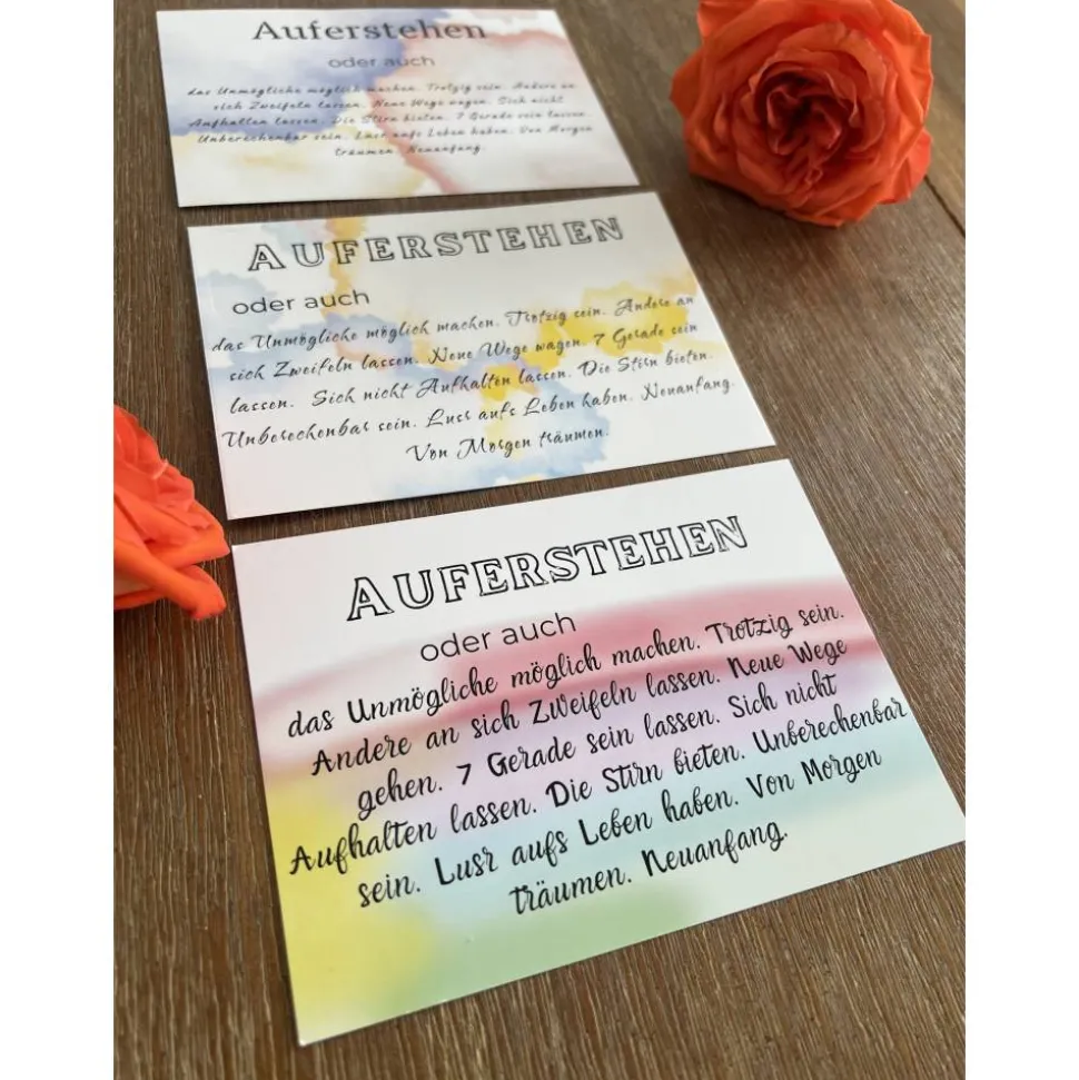 Diese selbstgestaltete Postkarte ist ein echtes Unikat. Sie verbindet einen tiefsinnigen, motivierenden Text mit einer modernen Optik, die sofort Leichtigkeit und Freude verbreitet. Perfekt für alle, die das Wort „Auferstehen“ als persönlichen Neuanfang, Kraftquelle oder mutiges Statement interpretieren möchten.
