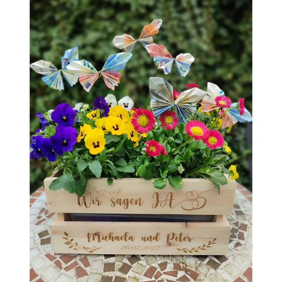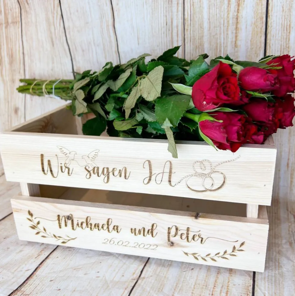 Deine liebevollen Worte werden auf die Aufbewahrungskiste graviert und in Verbindung mit kleinen Geschenken wird die Hochzeit unvergesslich.