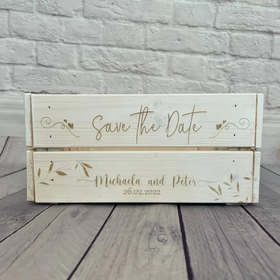 Deine liebevollen Worte werden auf die Aufbewahrungskiste graviert und in Verbindung mit kleinen Geschenken wird die Hochzeit unvergesslich.