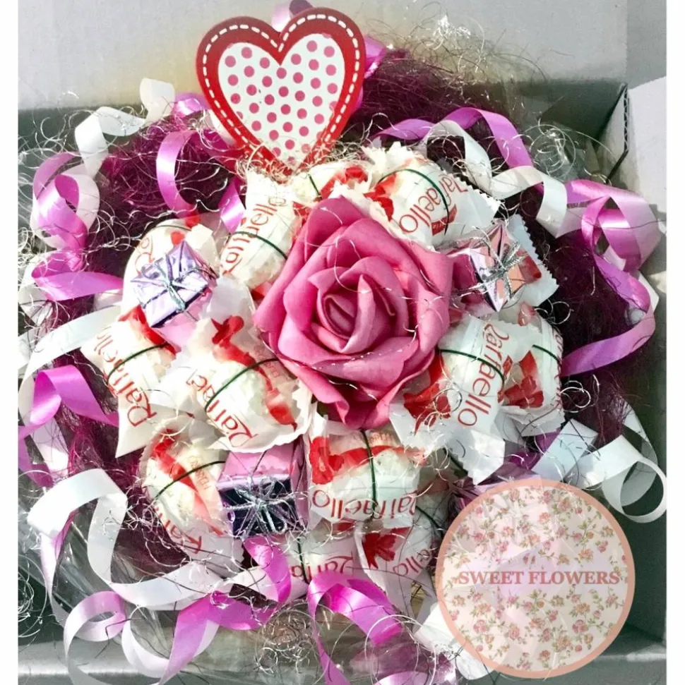 Dieser besonders schöne Strauß besteht aus vielen leckeren Pralinen, die in liebevoller Handarbeit zu einem schönen Strauß gebunden und mit Dekoration verziert werden. Die Materialien, wie zum Beispiel die Kunstrose / Kunstblume / Herz / Dekokugeln / Mini-Geschenke / etc. dienen auch nach dem Vernaschen des Straußes weiterhin als schmückende Dekoration. Der Strauß wird mit Folie als Geschenk verpackt.