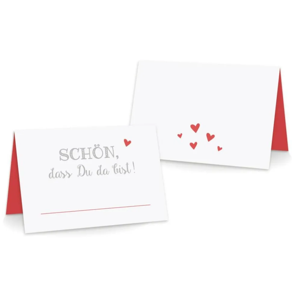 Premium Tischkarten aus hochwertigem und stabilem Papier mit sehr schönem Aufdruck in Schrift-grau Herzen-rot.
