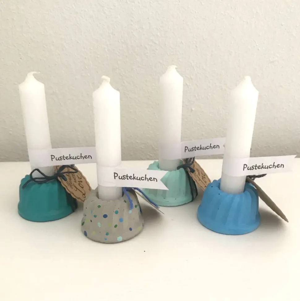 Sie sind aus Beton gefertigt und liebevoll bemalt oder mit Pünktchen verziert. Der Kauf beinhaltet neben einer kleinen Kerze auch die Banderole „Pustekuchen“.
