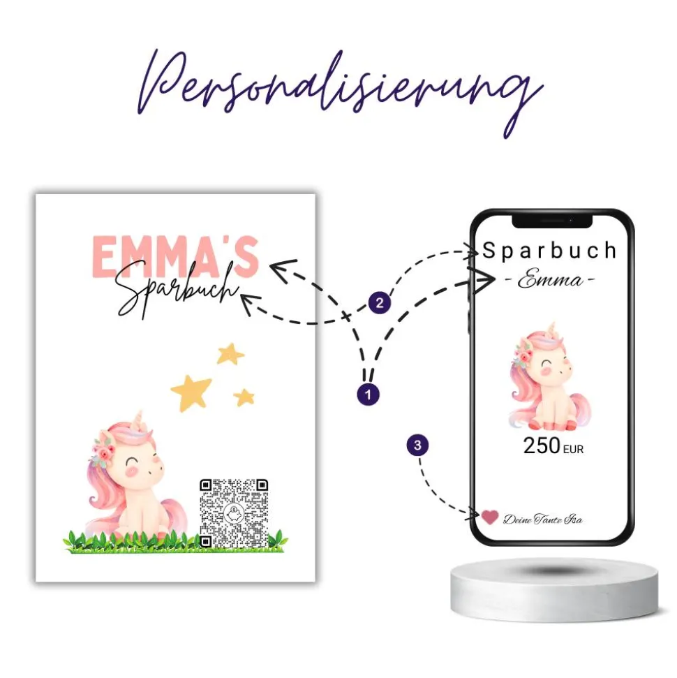 QR-Code Sparbuch Einhorn | Märchenhaftes Geldgeschenk für Mädchen | DIY Last-Minute Download | PNG zum Ausdrucken