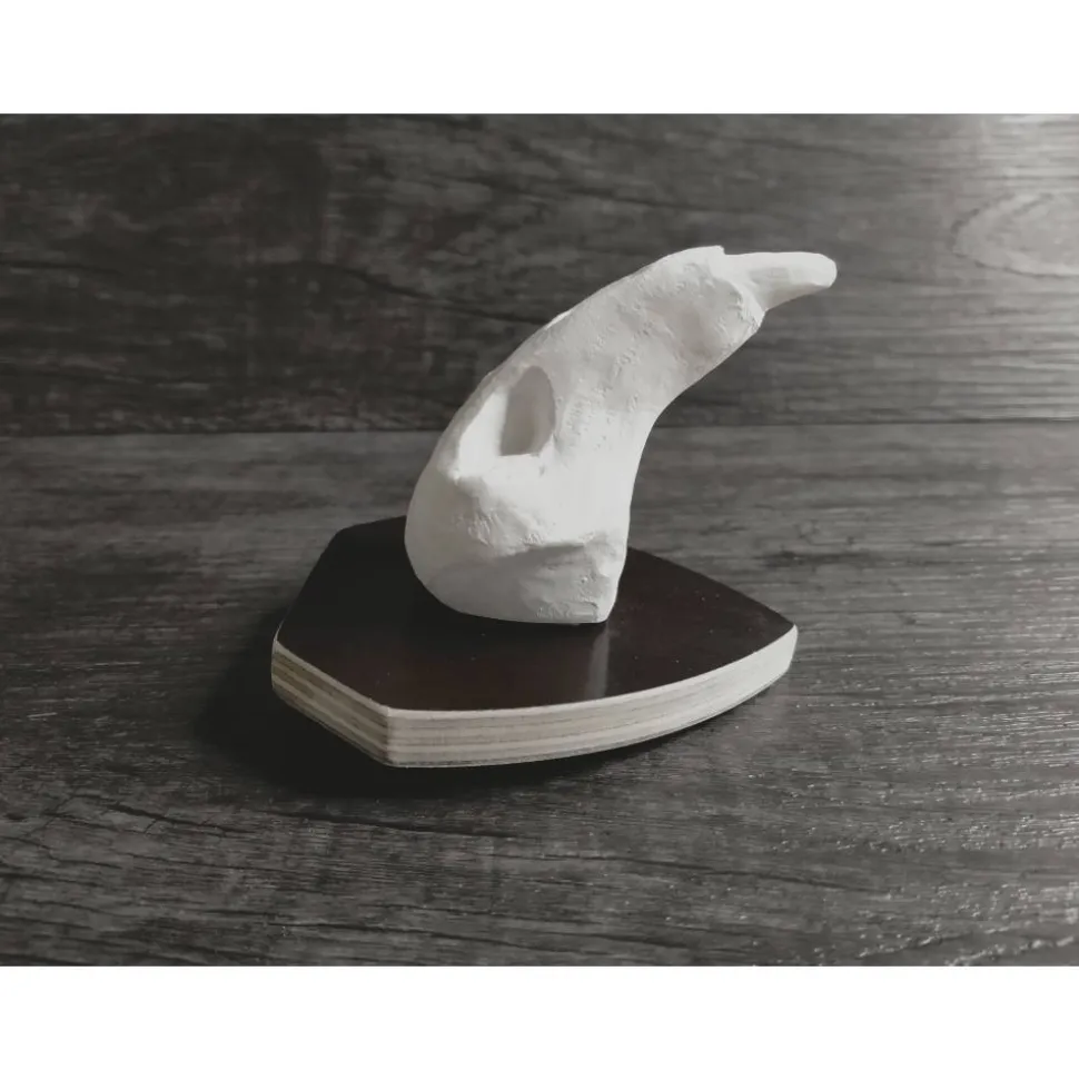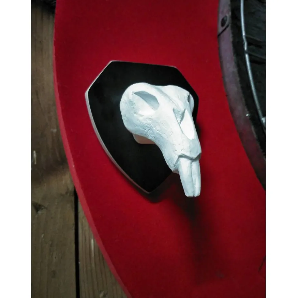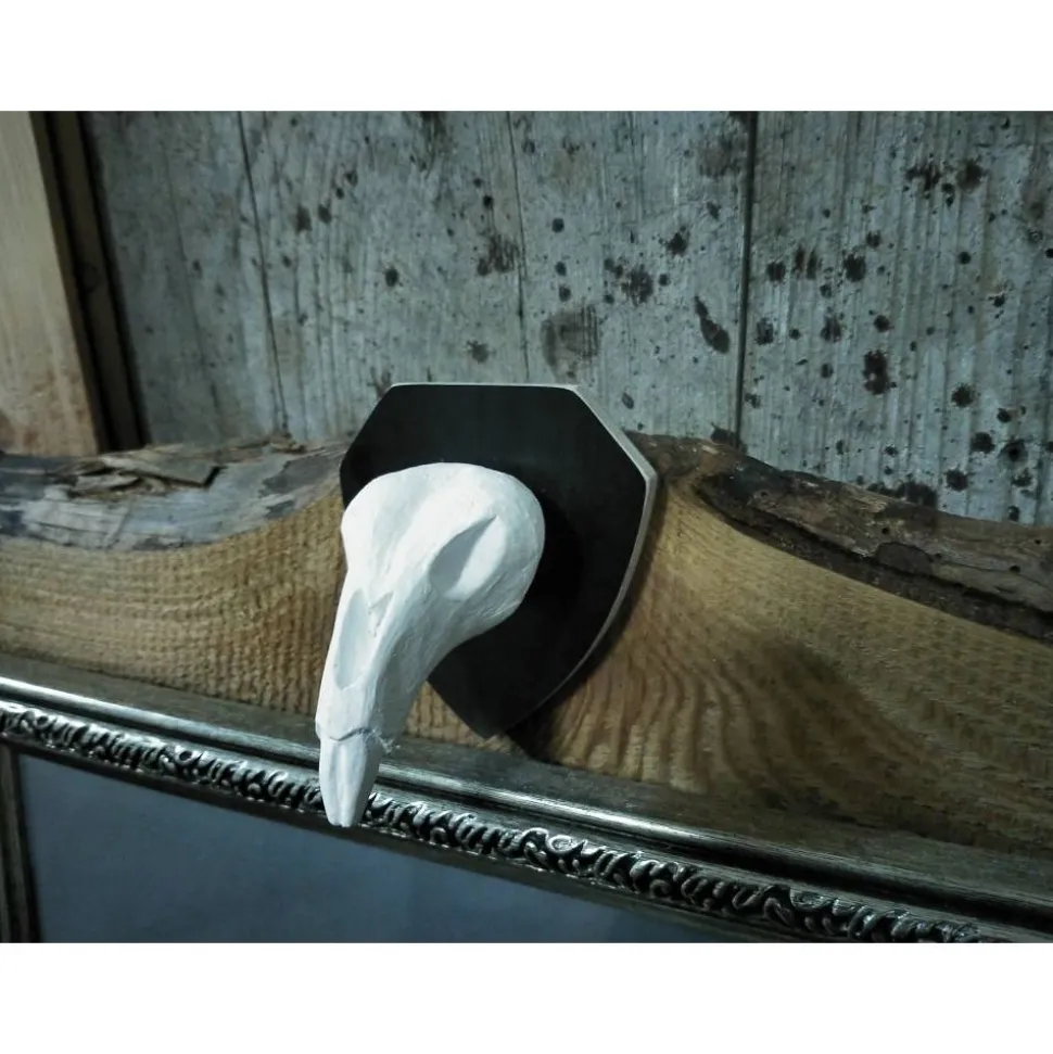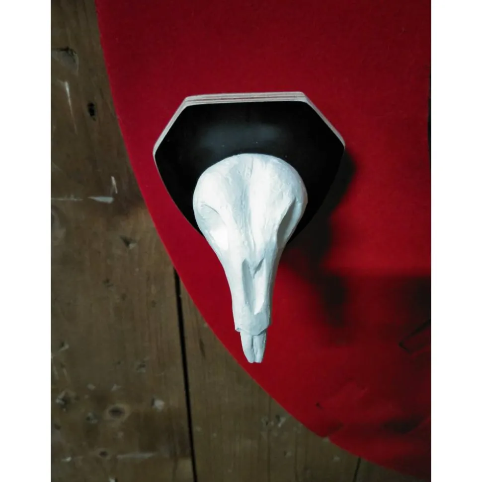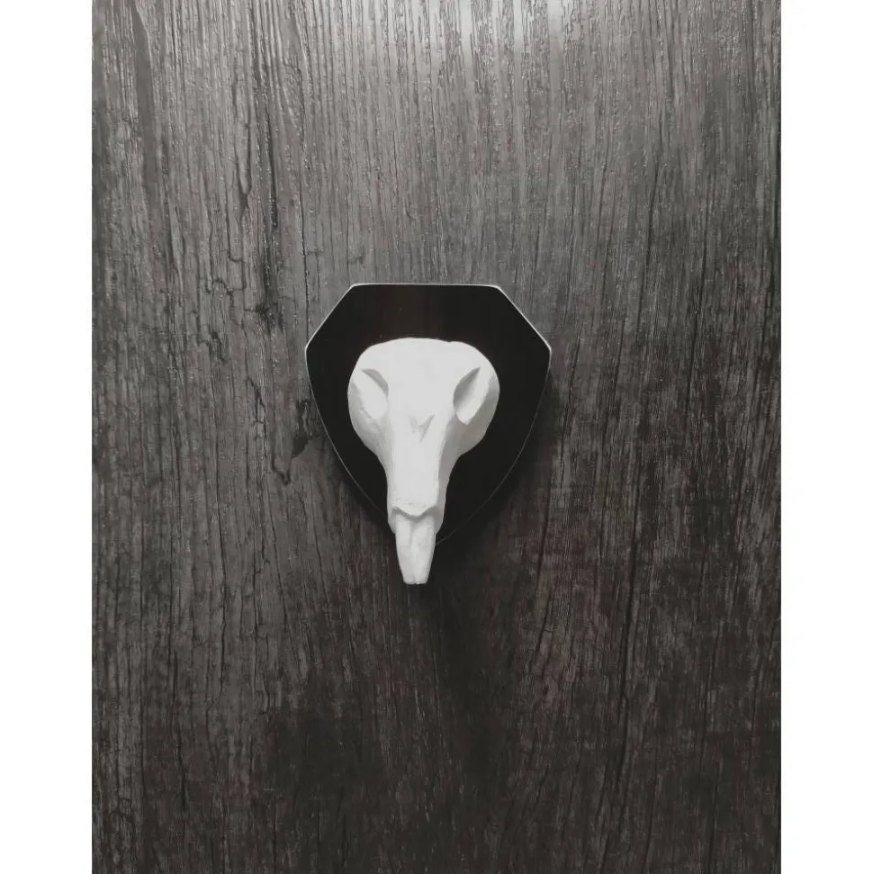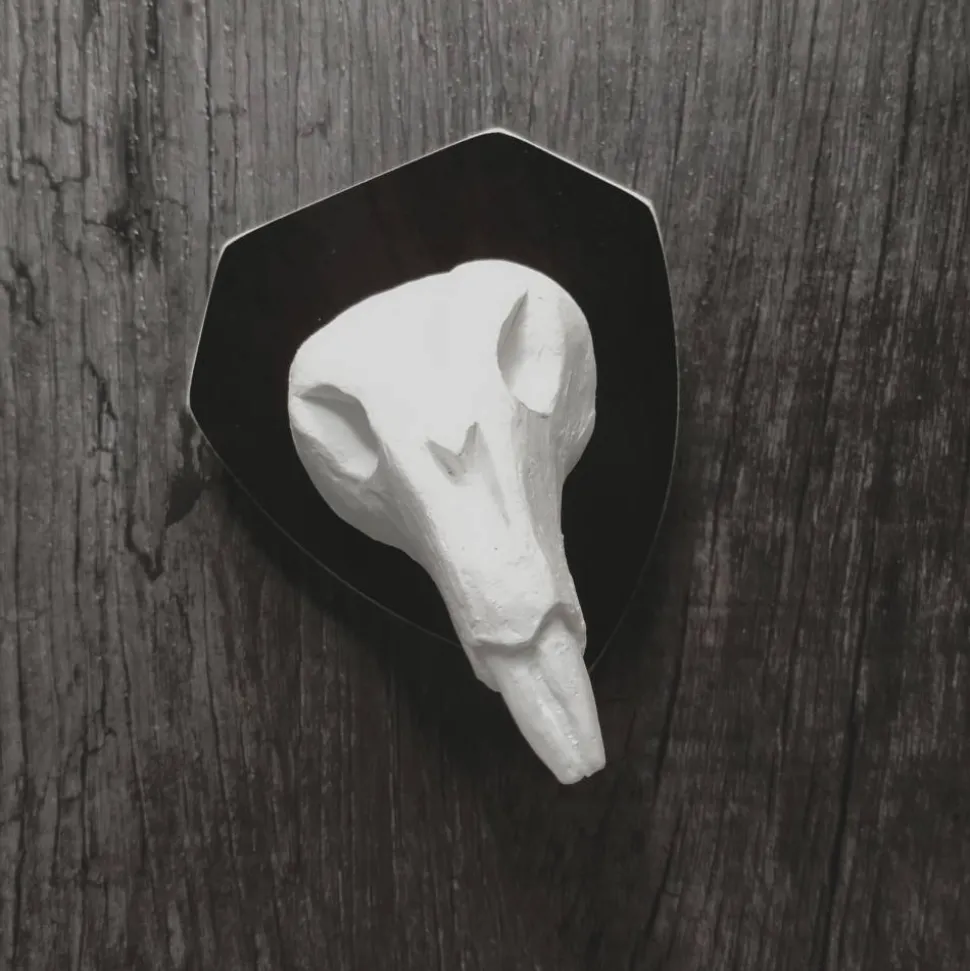 Rudi trophy – der Schädel auf einer Holzplatte mit Wandaufhänger. Der Rattenkopf ist aus steinharter Figurengießmasse gefertigt. Also eine vegane Trophäe. Die Holzplatte ist Schichtholz. Auf der Rückseite befindet sich ein ein stabiler Aufhänger aus Metall.