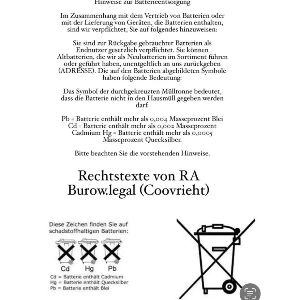 Sie sind zur Rückgabe gebrauchter Batterien als Endnutzer gesetzlich verpflichtet. Sie können Altbatterien, die wir als Neubatterien im Sortiment führen oder geführt haben, unentgeltlich an uns zurückgeben (ADRESSE). Die auf den Batterien abgebildeten Symbole haben folgende Bedeutung: