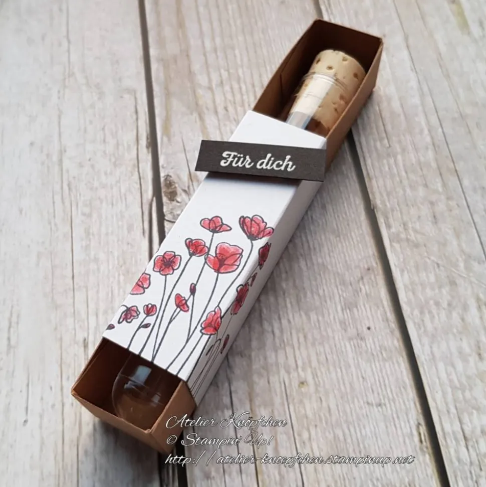 Zur Herstellung des Artikels wurden hochwertigen Produkte von Stampin‘ Up!© verwendet. Die Mohnblumen wurden von mir in schwarz auf weißen Farbkarton gestempelt und von Hand koloriert. Der Text „Für dich“ wurde in Weiß embossed.