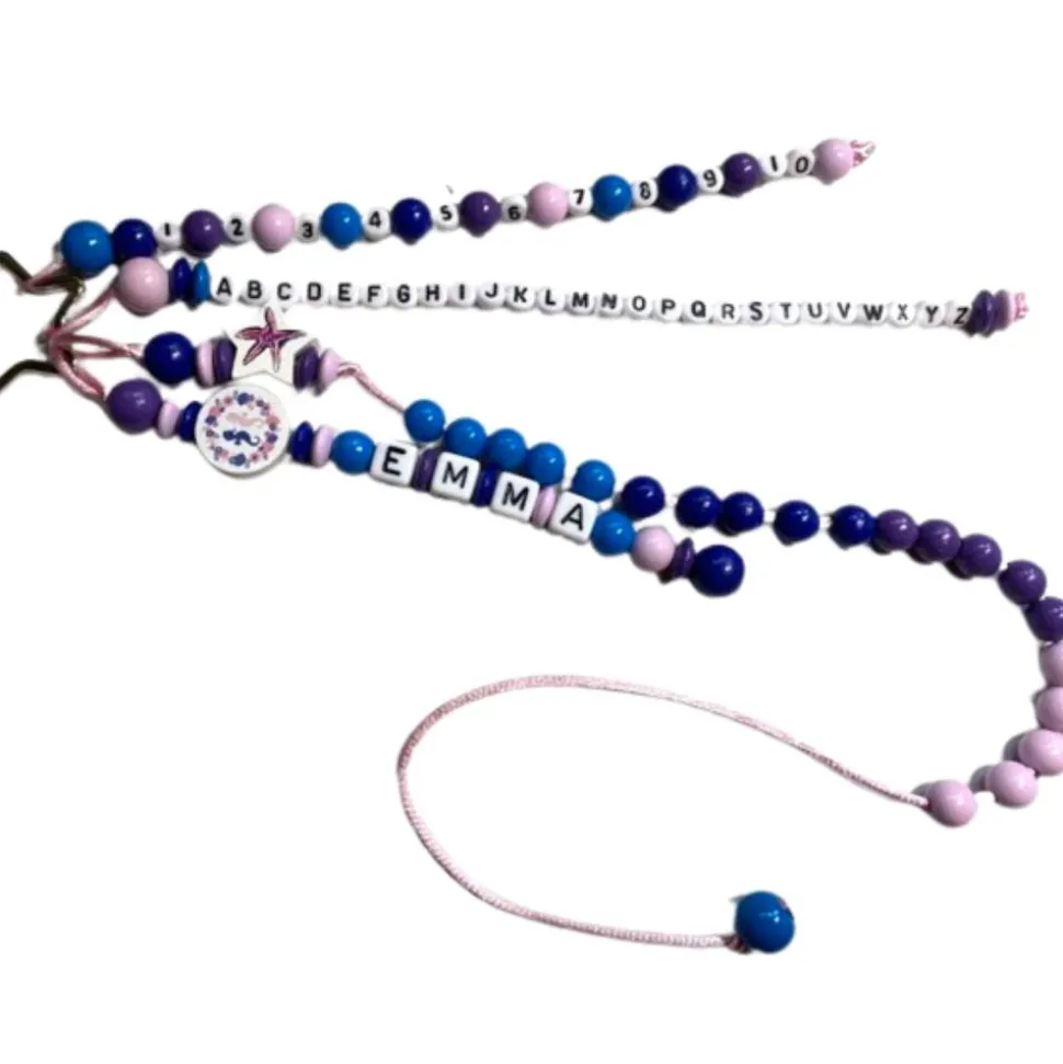 Verwendete Materialien: Holzperlen, Motivperlen, Kunststoffbuchstaben, PP Kordel, Schlüsselring