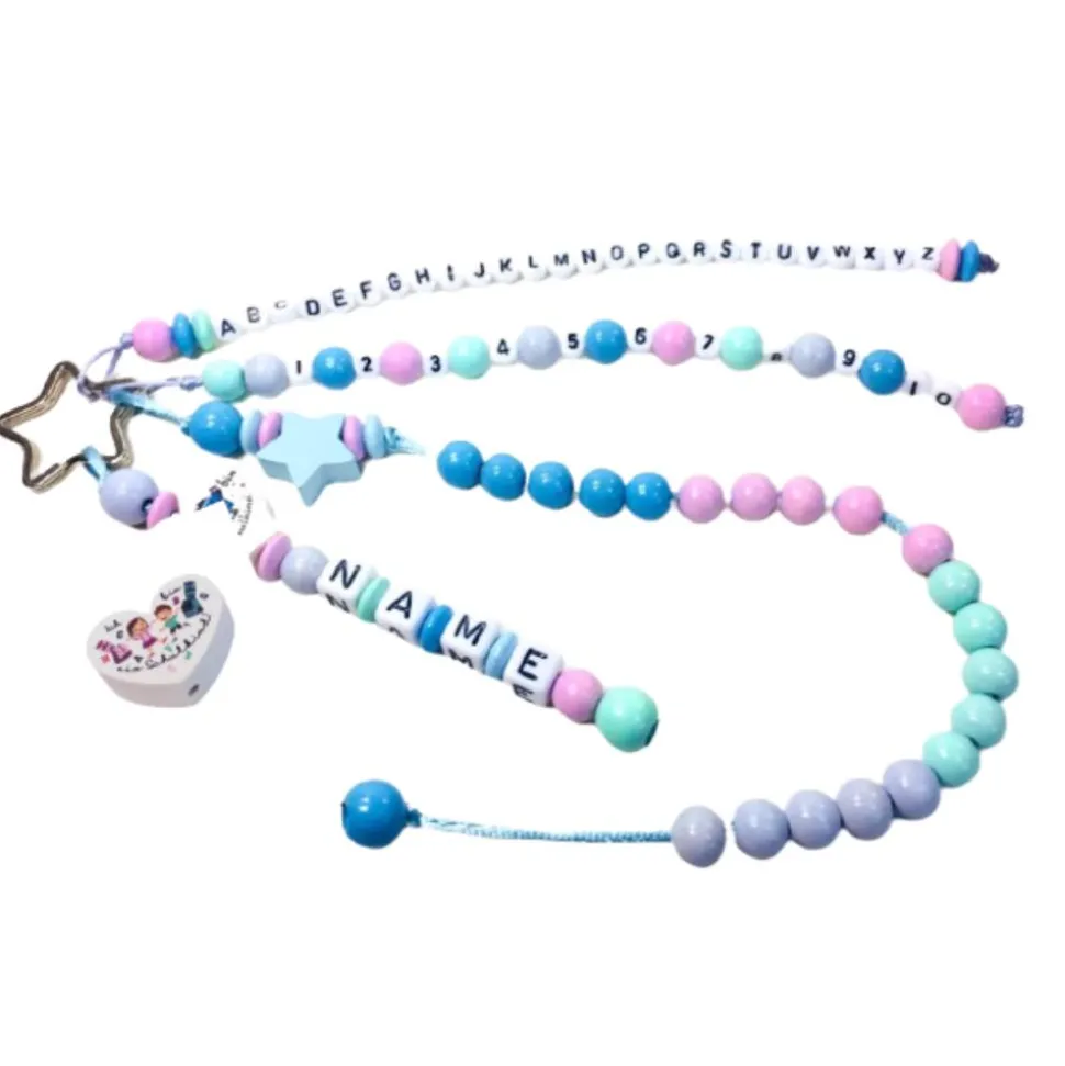 Verwendete Materialien: Holzperlen, Motivperlen, Kunststoffbuchstaben, PP Kordel, Schlüsselring