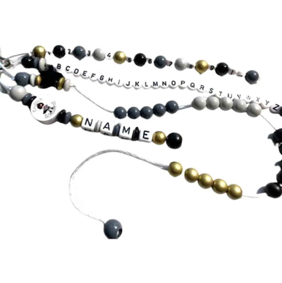 Verwendete Materialien: Holzperlen, Motivperlen, Kunststoffbuchstaben, PP Kordel, Schlüsselring