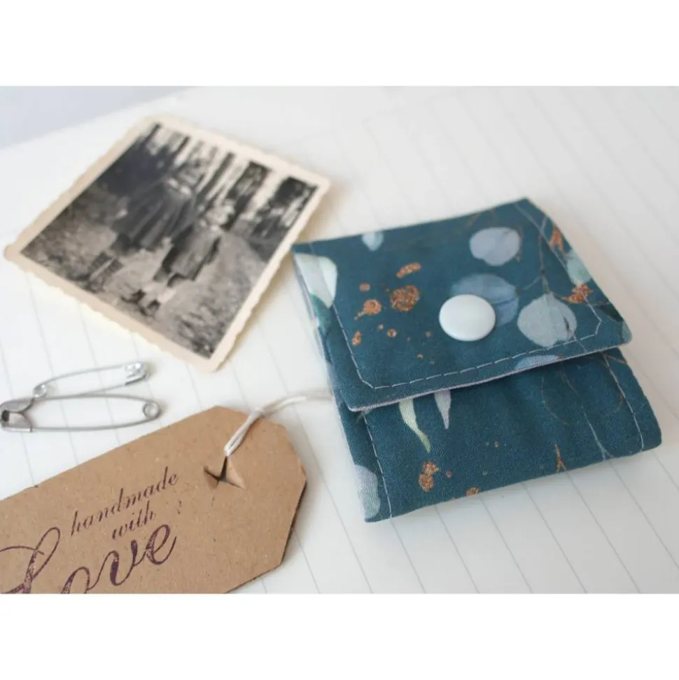 Das Täschchen besteht aus zwei verschiedenen Baumwollstoffen sowie Volumenvlies, das zur Verstärkung dient und das Täschchen schön griffig macht.