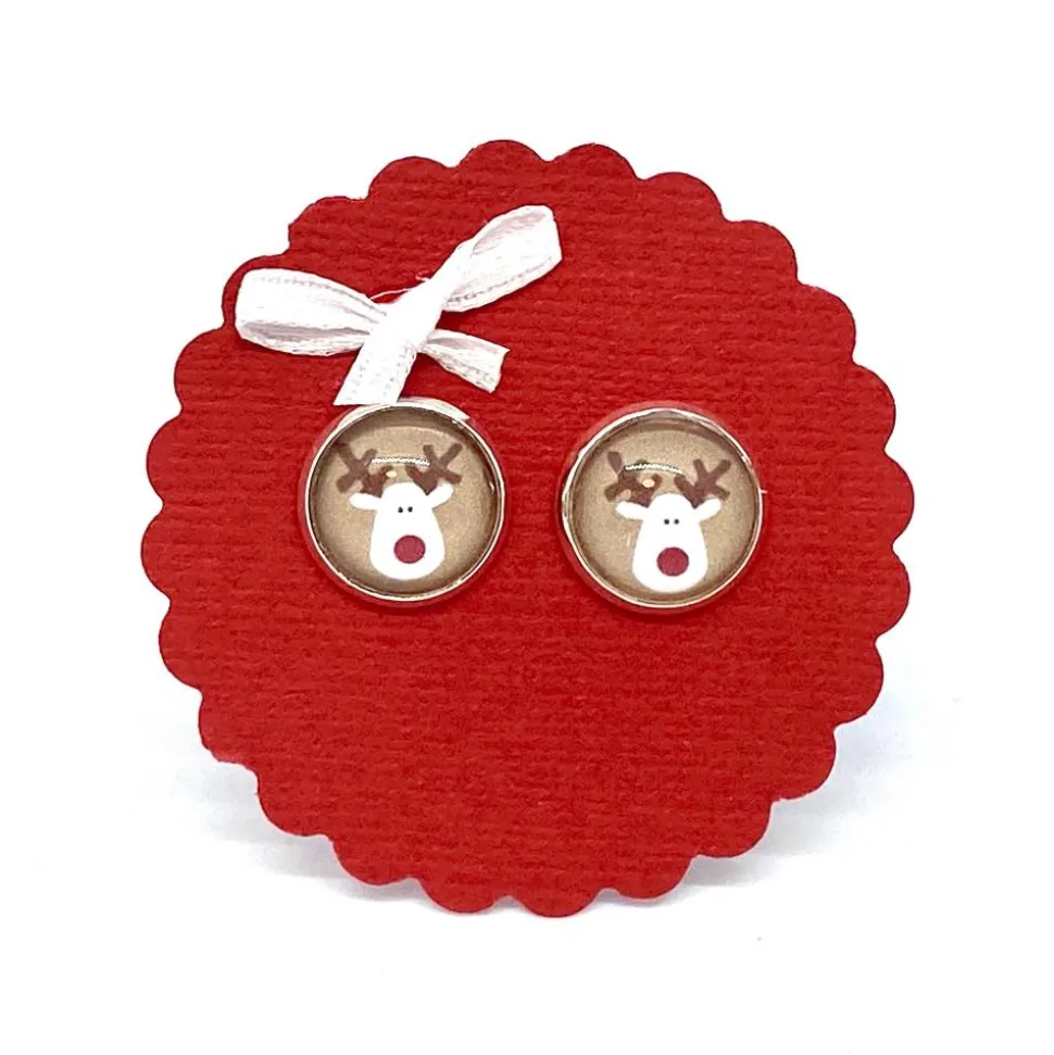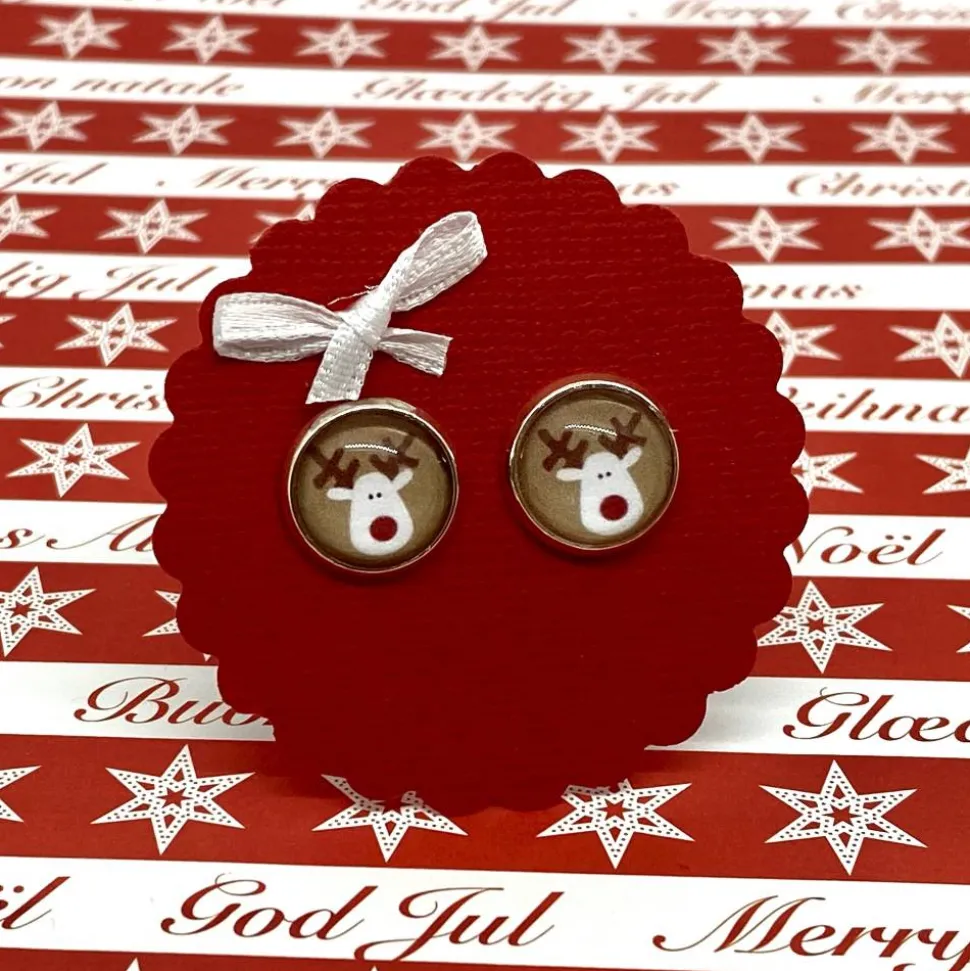 Diese hübschen Ohrstecker – Motiv: weißes Rentier aufbraun – haben eine silberfarbene Fassung. Sie sind mit Silikonstoppern versehen.