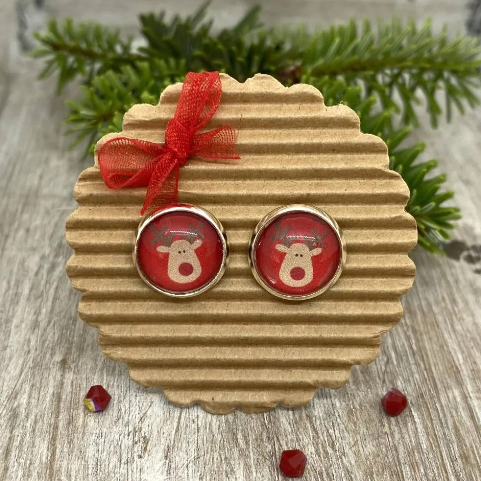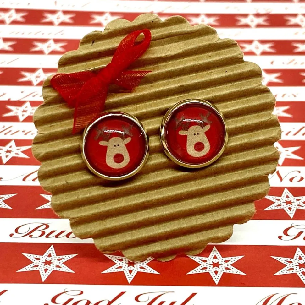 Diese niedliche Cabochon-Ohrstecker – Motiv: kleines Rentier auf rot – haben eine silberfarbene Fassung. Sie sind mit Silikonstoppern versehen.