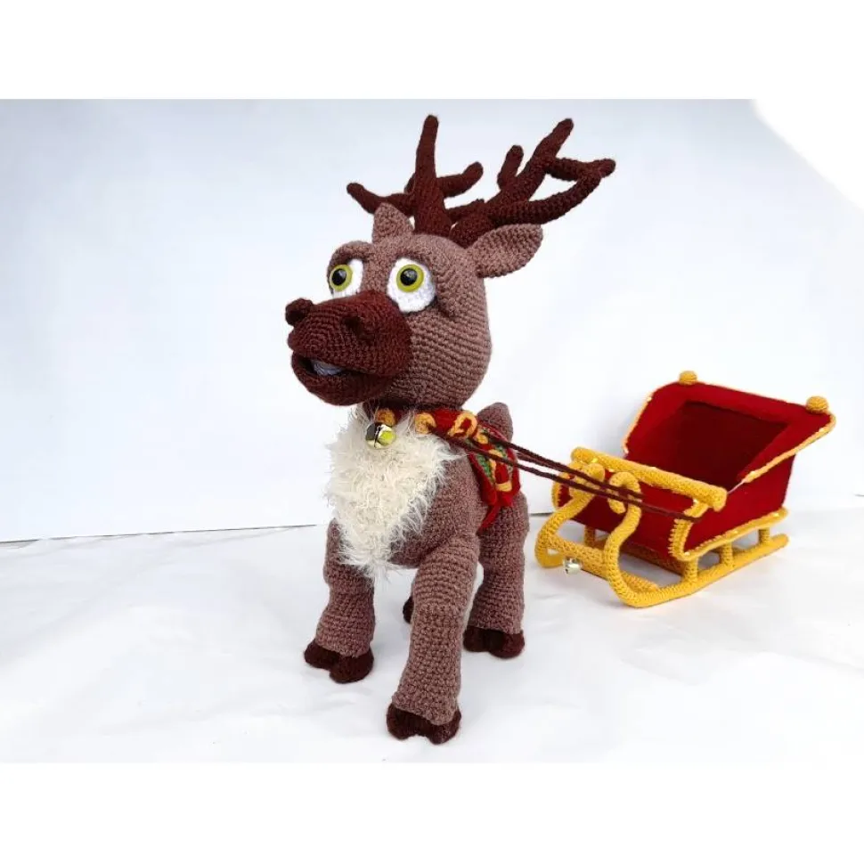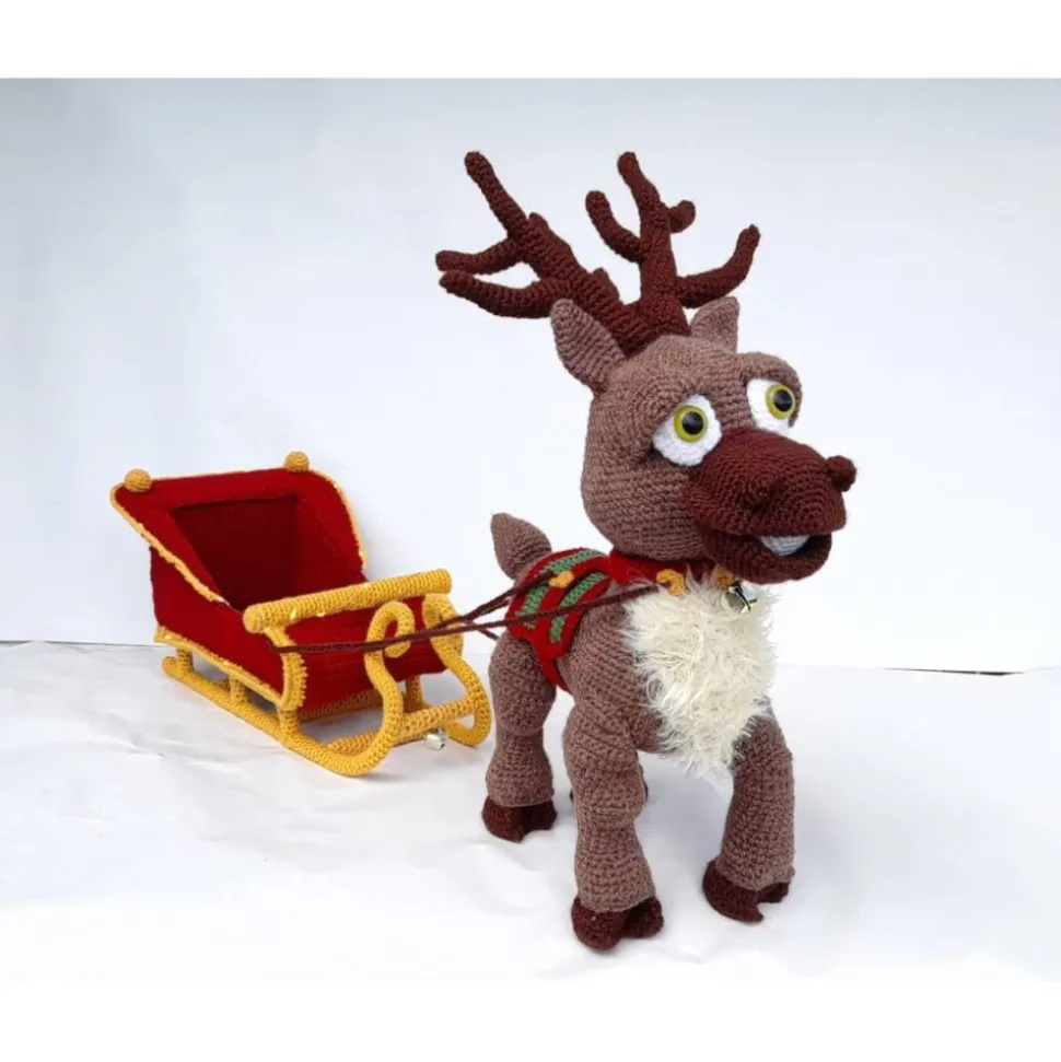 Das knuffige Rentier wird ca. 40×28 cm groß, der Schlitten dazu ca. 33×23 cm. Eine Micro-Lichterkette beleuchtet den dunkelroten/goldfarbenen Schlitten und sorgt für stimmungsvolle Akzente.
