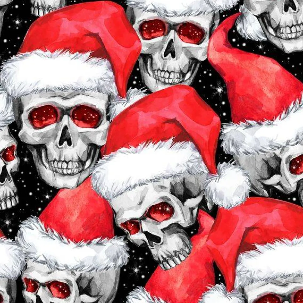Entdecke einen einzigartigen Weihnachtsstoff! Der Reststück Baumwollstoff mit Totenkopf-Motiv und Nikolausmütze ist perfekt für ausgefallene Nähprojekte.
