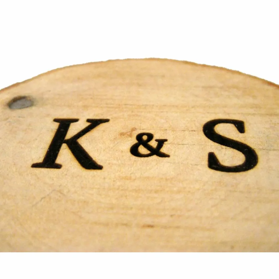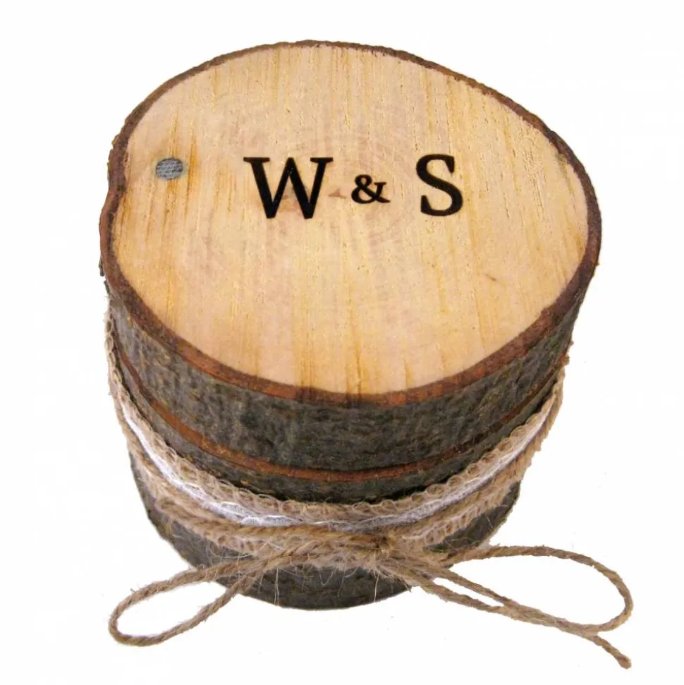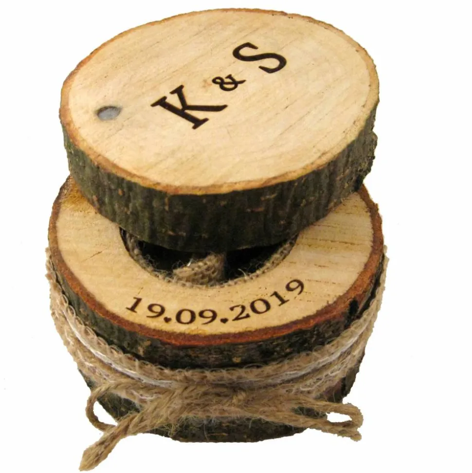 Die erste Buschstaben der beiden Vornamen werden stilvoll auf dem Baumstamm-Deckel angebracht. Das Datum der Hochzeit wird an der Seite angebracht und erscheint wenn man den Deckel aufschiebt.