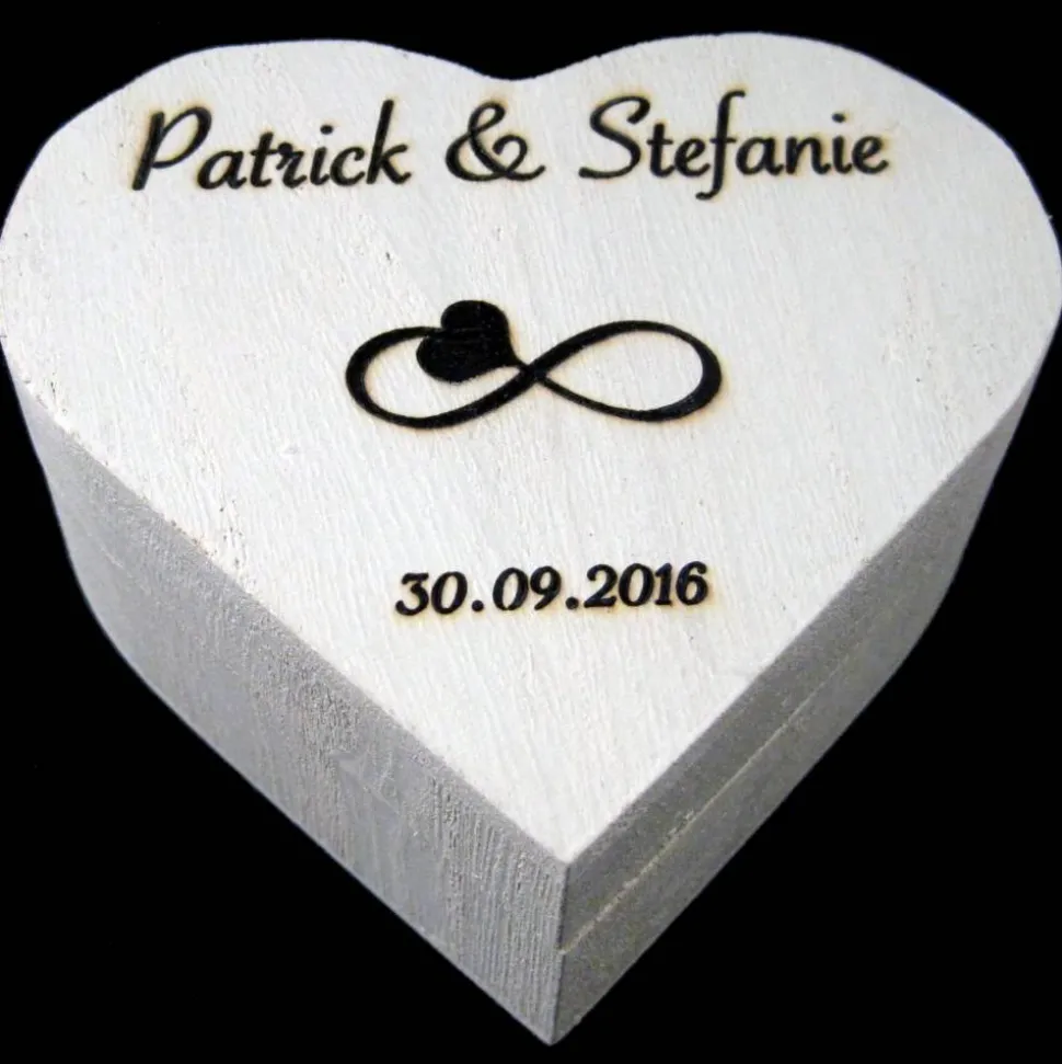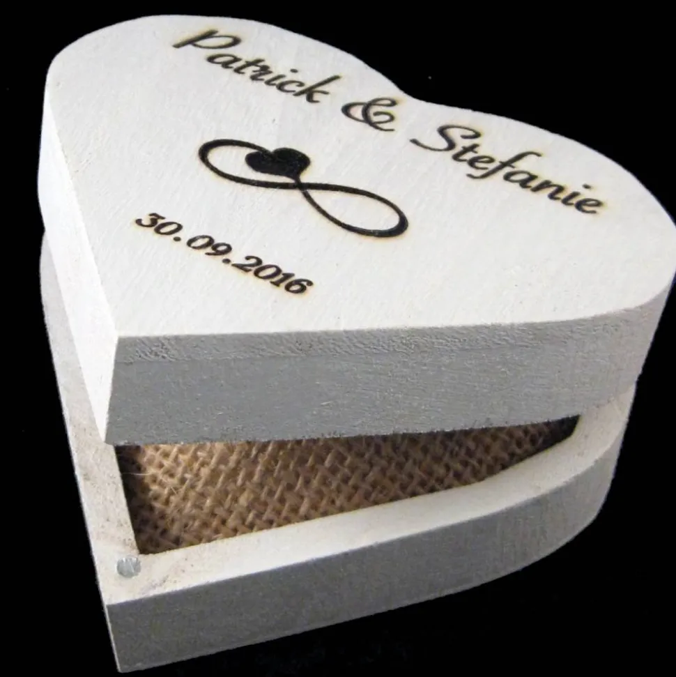 Das Ringkissen ist aus hochwertiger Baumwolle oder Jutestoff genäht und in 3 Farben bestellbar (rot, weiß und Natur (Jute). Die Ringen können ganz praktisch an den Satin- oder Jutebändern festgebunden werden. Die Vornamen und das Hochzeitsdatum werden nach Wünsch -wie auf den Bilder- stilvoll im Holzbox eingraviert.