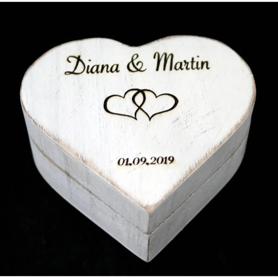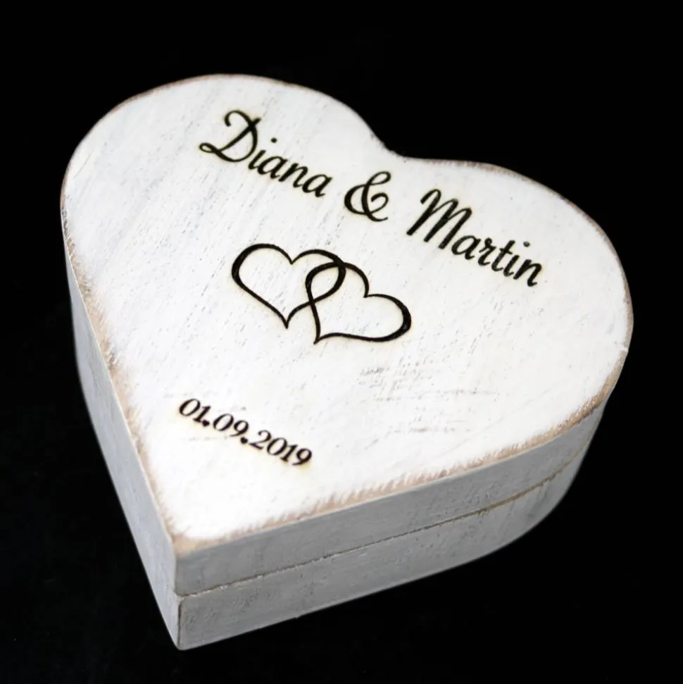Die Vornamen und das Hochzeitsdatum werden nach Wünsch -wie auf den Bilder- stilvoll auf der Holzbox eingraviert.