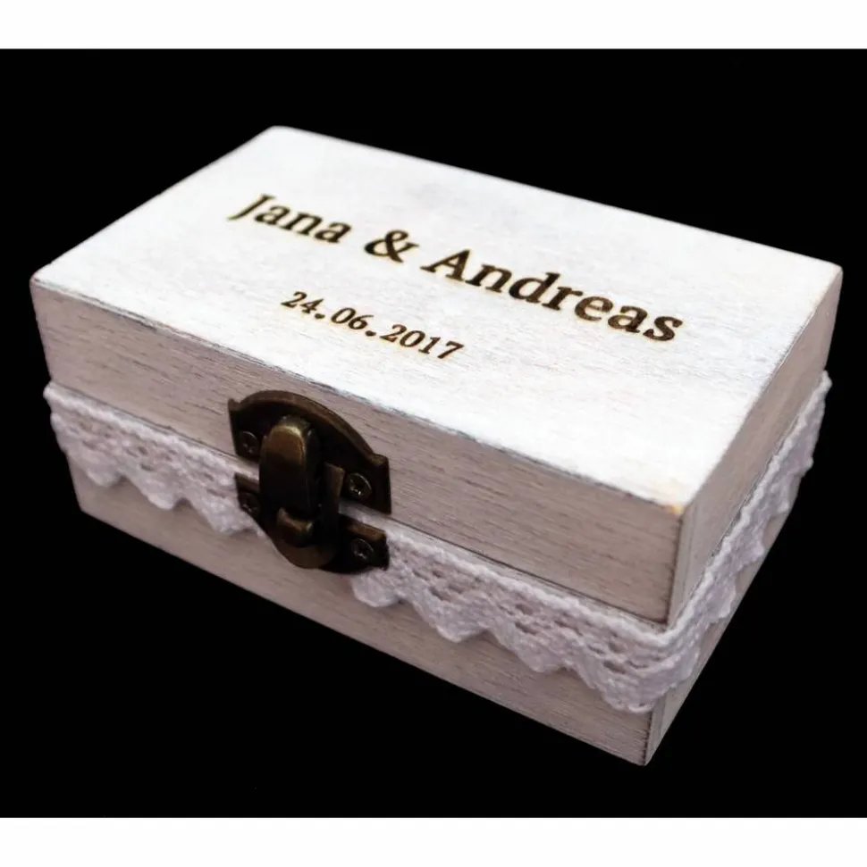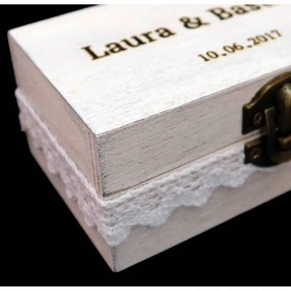 Die Vornamen und das Hochzeitsdatum werden nach Wünsch -wie auf den Bilder- stilvoll auf der Holzbox eingraviert.
