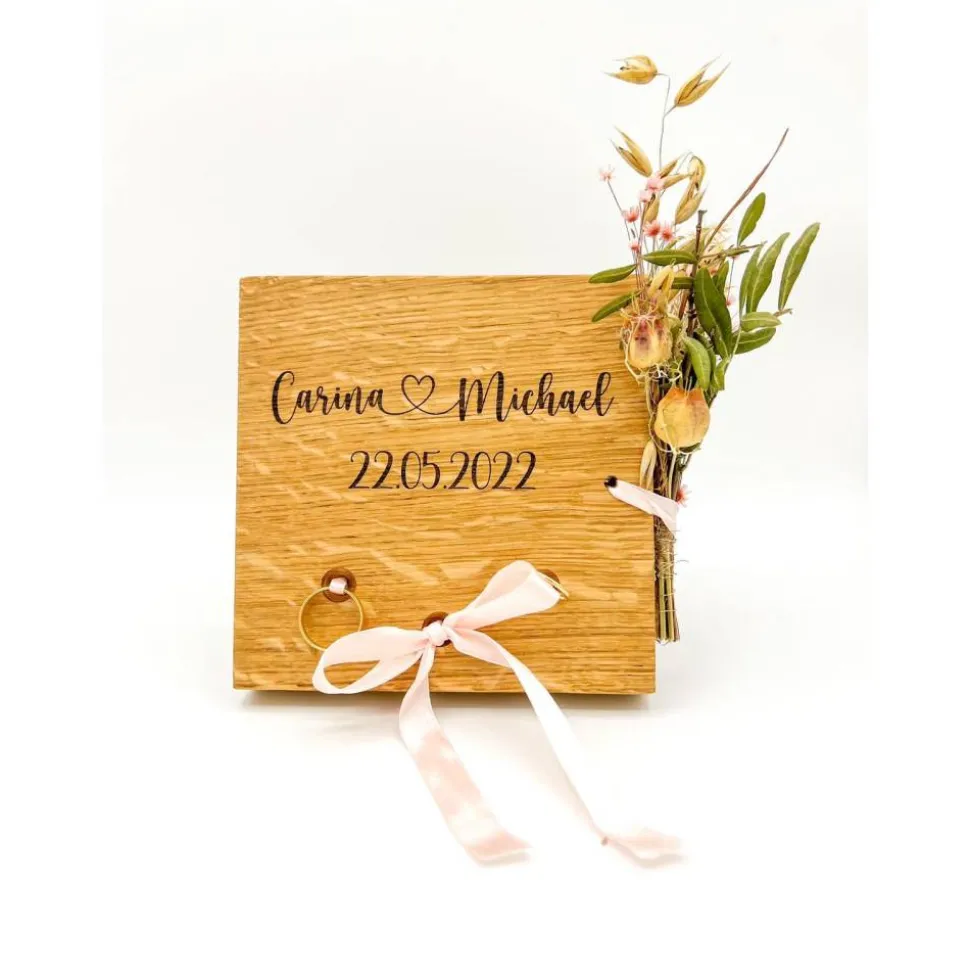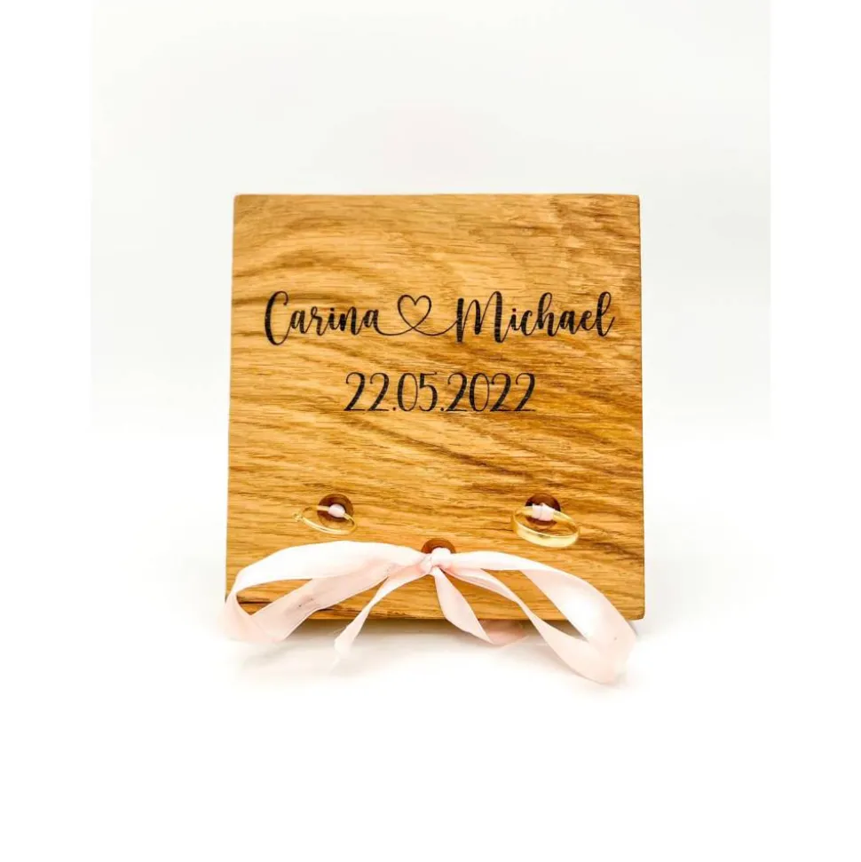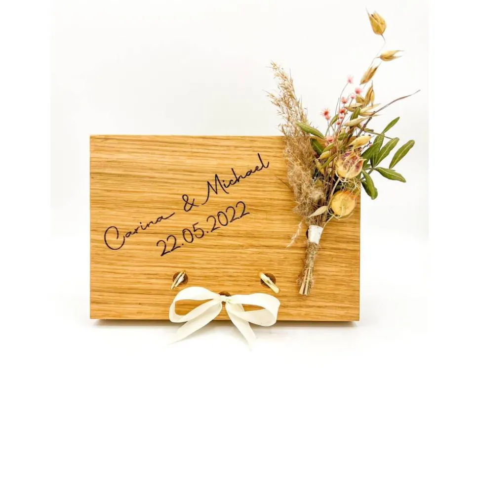 Unser Ringbrett fertigen wir aus hochwertigem massivem Eichenholz. Mit Hilfe von 4 dezenten Bohrungen könnt Ihr sowohl die Ringe als auch die Blumendekoration befestigen.