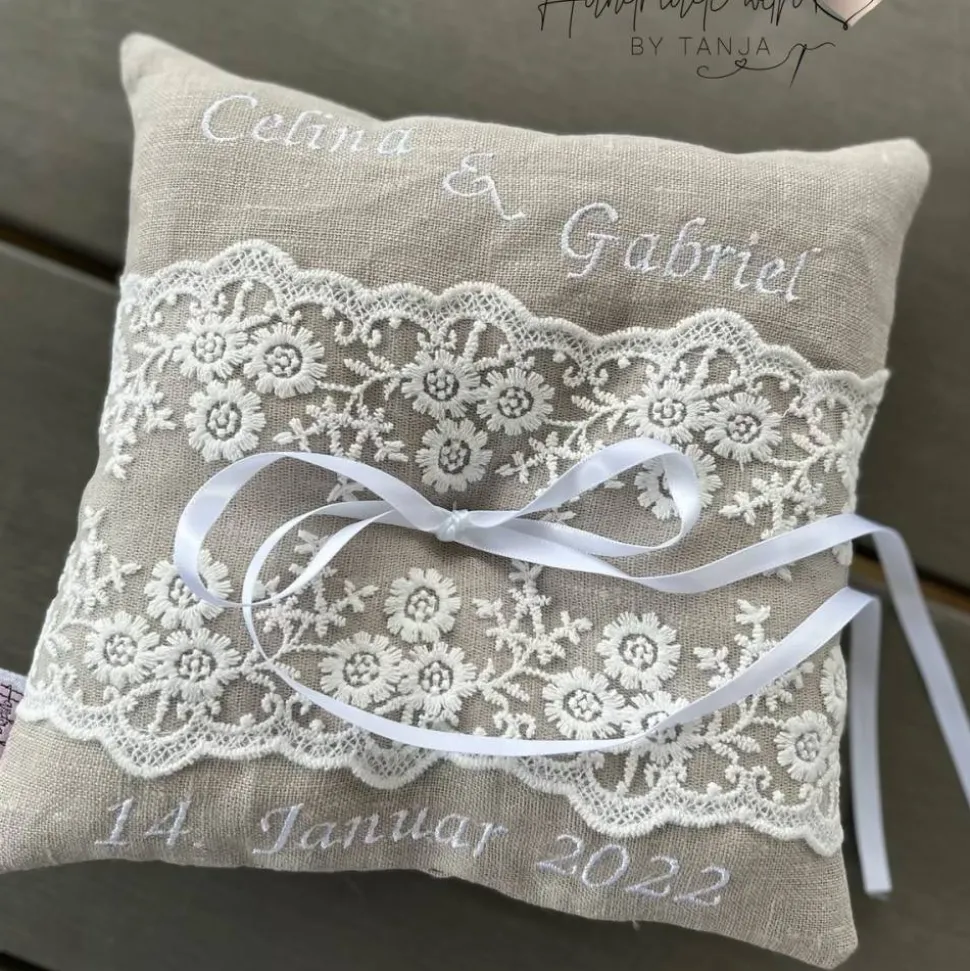 liebevoll genähtes Ringkissen mit einer wunderschönen Spitze im Vintage-Stil – durch die Bestickung ist jedes Trägerkissen ein Unikat. Perfekt für diesen ganz besonderen Tag ❤️