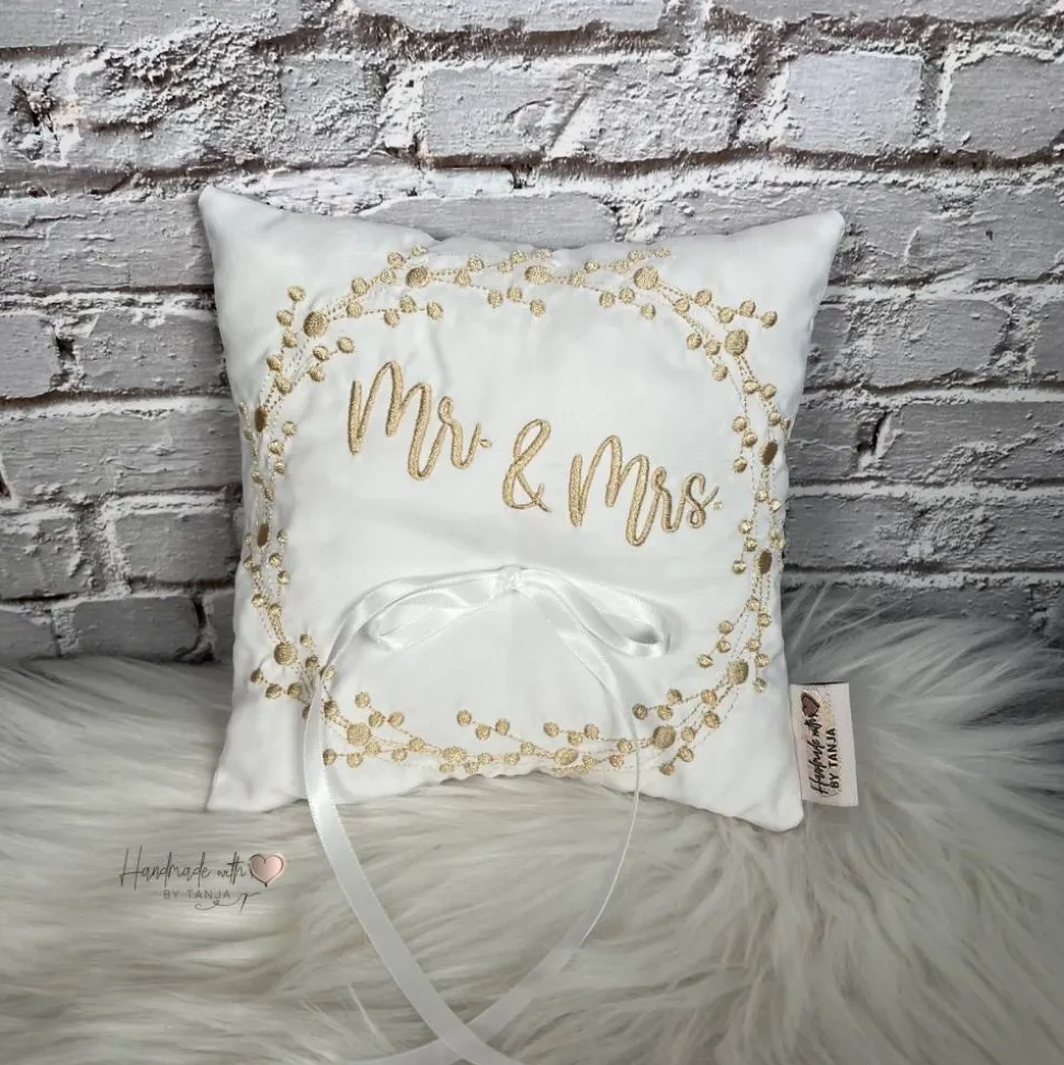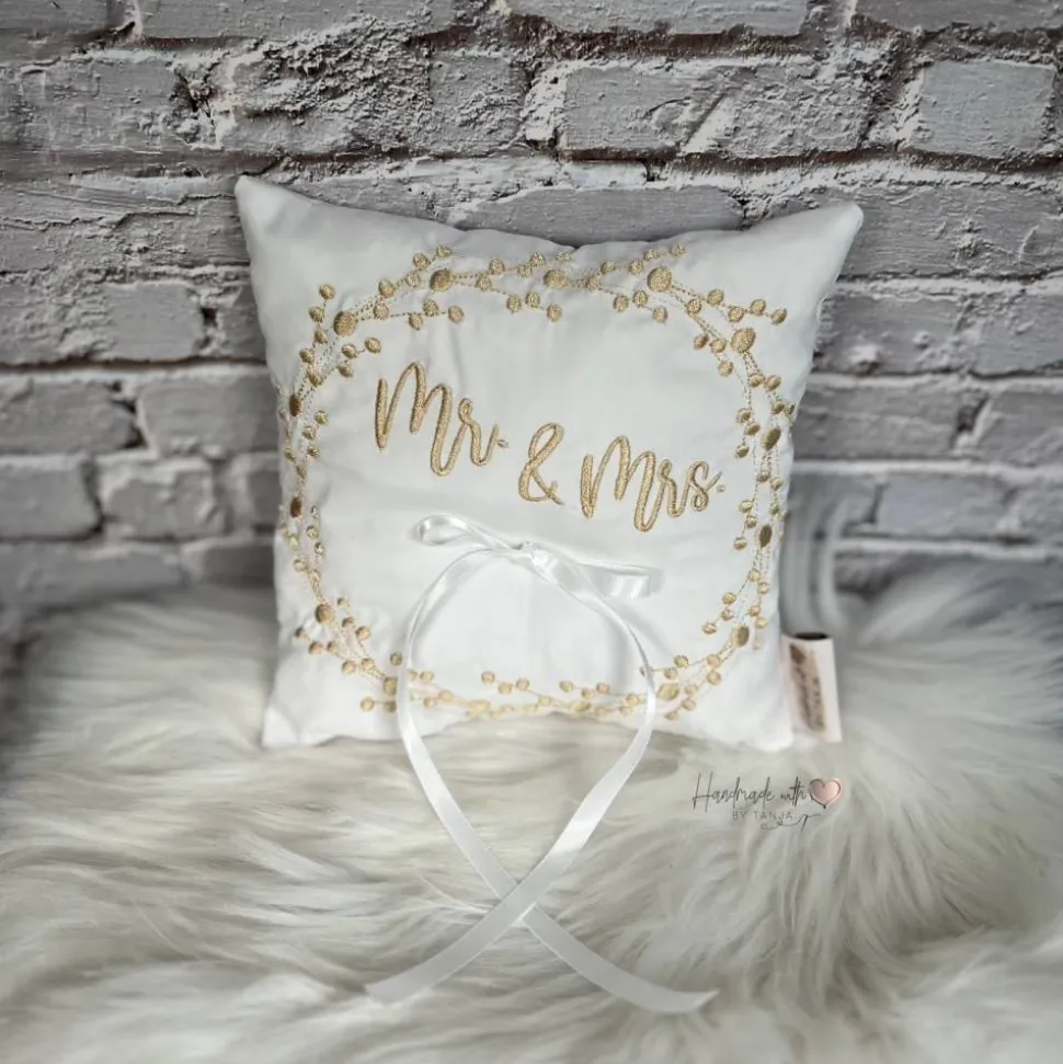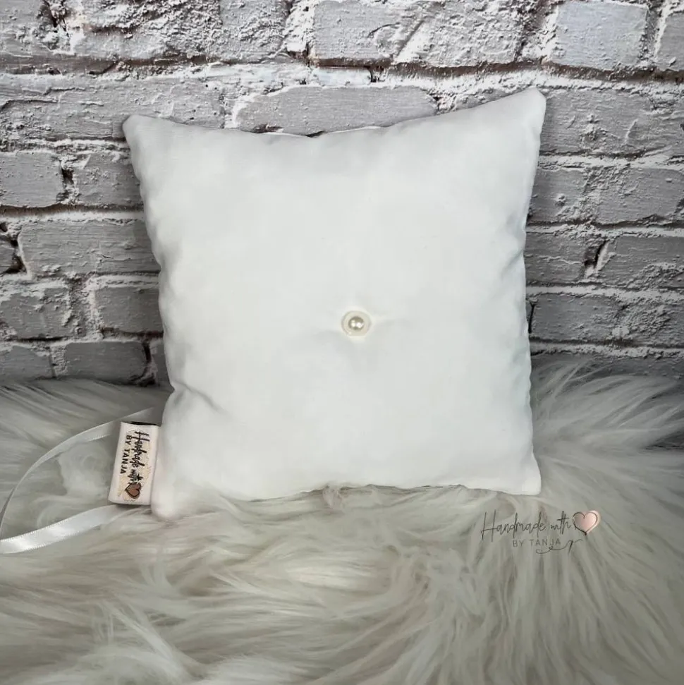 Dieses wunderschöne Ringkissen ist der perfekte Begleiter für den schönsten Tag im Leben. Das Kissen ist aus hochwertigem Stoff gefertigt. In die Mitte habe ich eine Satinschleife befestigt. Dort finden die Eheringe ihren Platz und können dort am besten mit einem leichten Knoten befestigt werden.