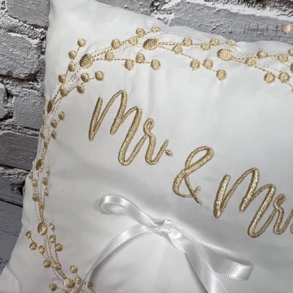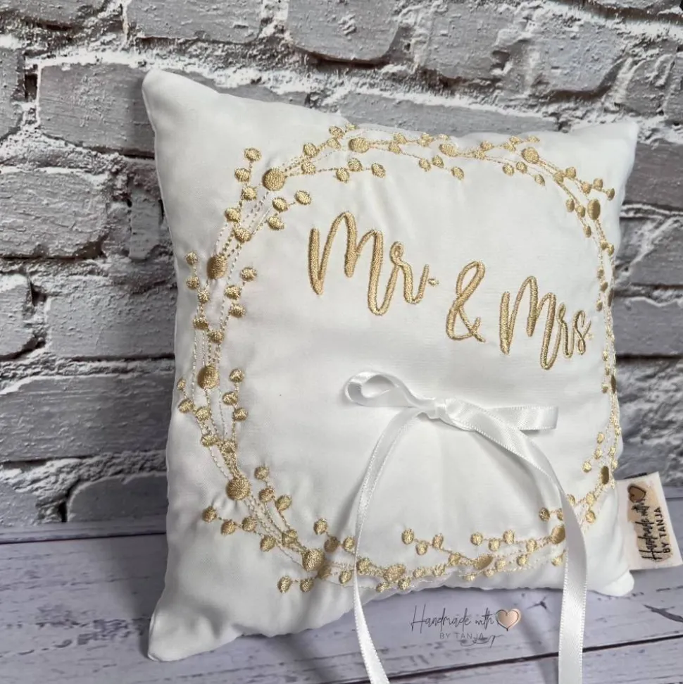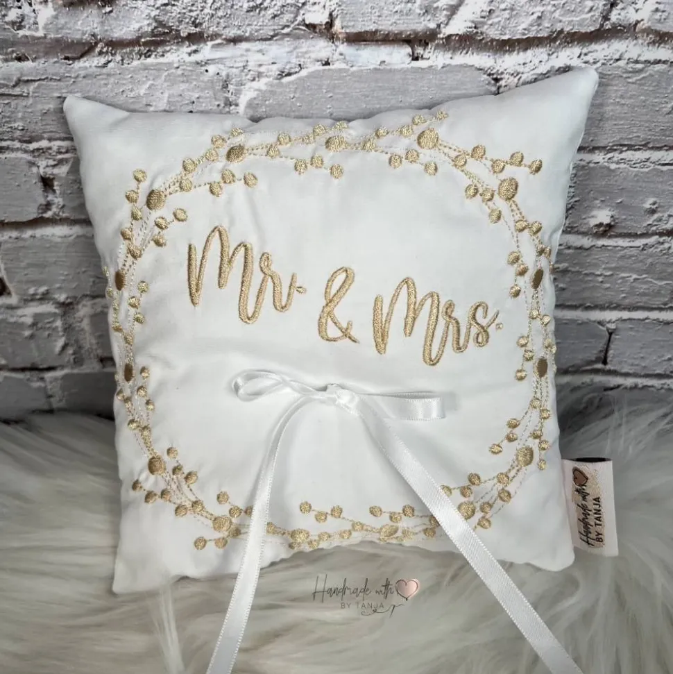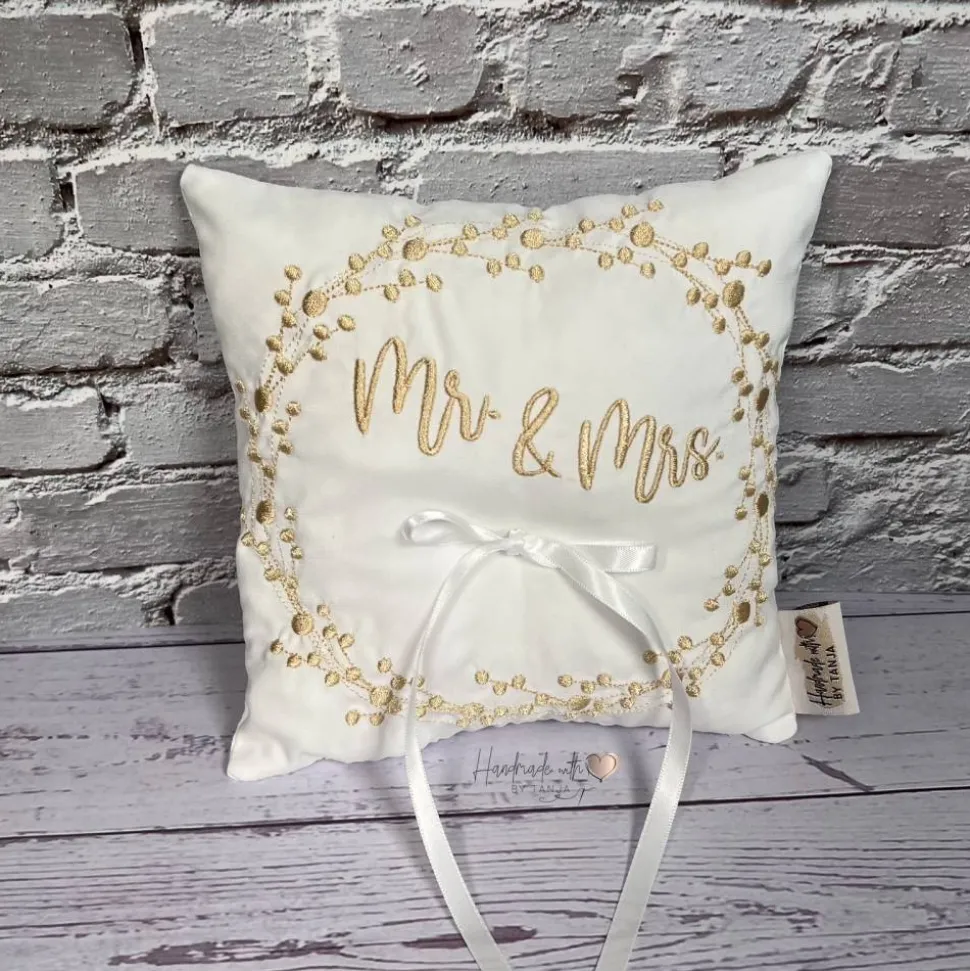 Dieses wunderschöne Ringkissen ist der perfekte Begleiter für den schönsten Tag im Leben. Das Kissen ist aus hochwertigem Stoff gefertigt. In die Mitte habe ich eine Satinschleife befestigt. Dort finden die Eheringe ihren Platz und können dort am besten mit einem leichten Knoten befestigt werden.