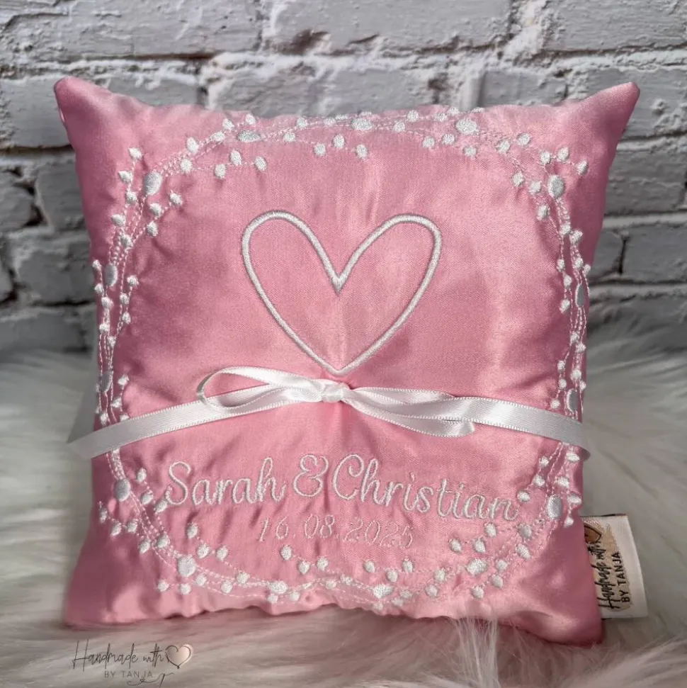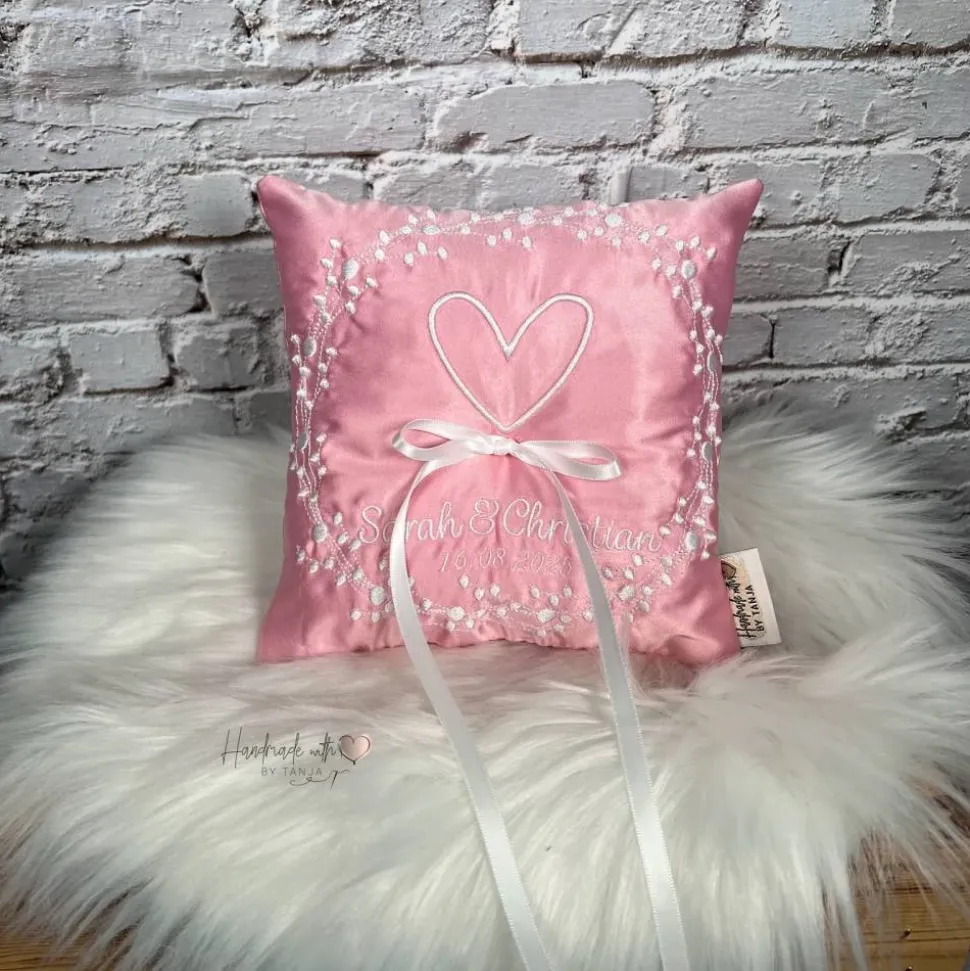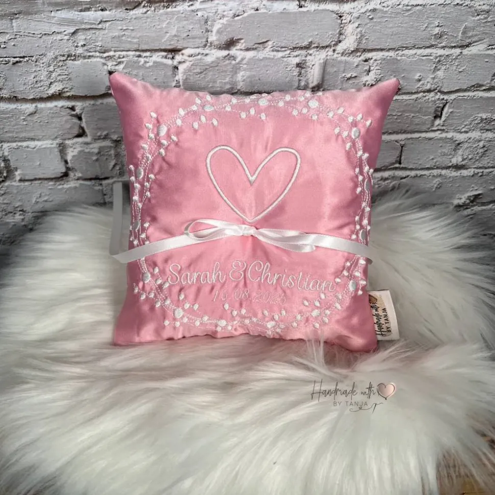 Dieses wunderschöne Ringkissen in rosa ist der perfekte Begleiter für den schönsten Tag im Leben. Das Kissen ist aus hochwertigem Stoff gefertigt. In die Mitte habe ich eine Satinschleife befestigt. Dort finden die Eheringe ihren Platz und können dort am besten mit einem leichten Knoten befestigt werden.