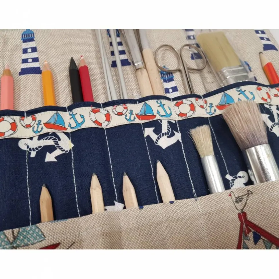 Filzmaler und sonstige Schreibutensilien, Schere und Pinsel können eingerollt werden.