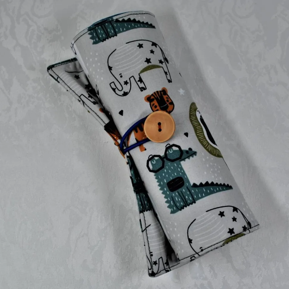 Einfach zu handhaben: Du rollst das Mäppchen einfach zusammen und verschließt es mit einer dehnbaren Gummischlaufe.
