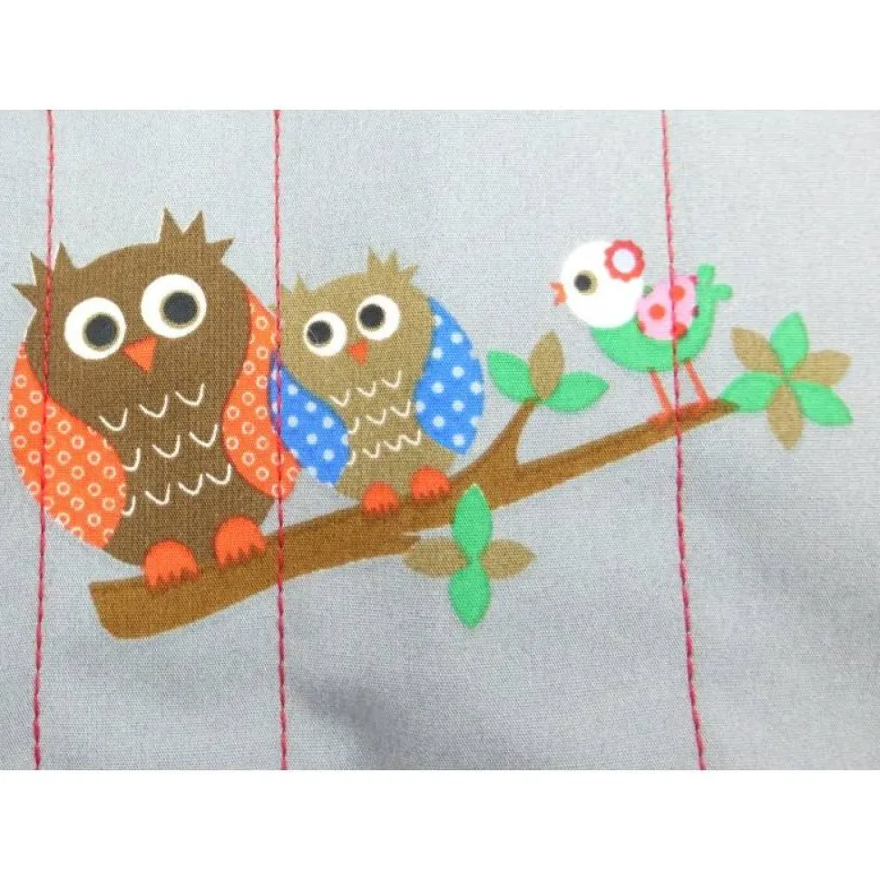 Genäht aus einem wunderschönen Stoff mit Eulen und Vögelchen, kombiniert mit Erdbeerrot und weißen Pünktchen.
