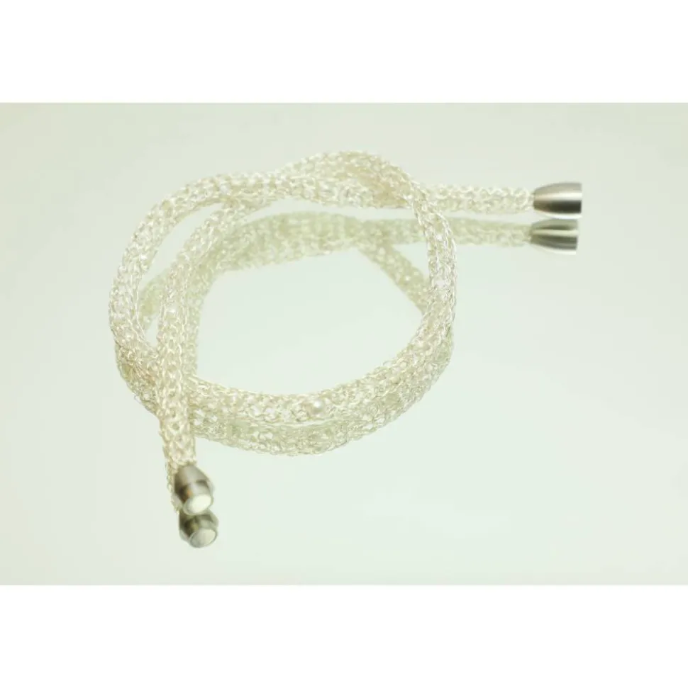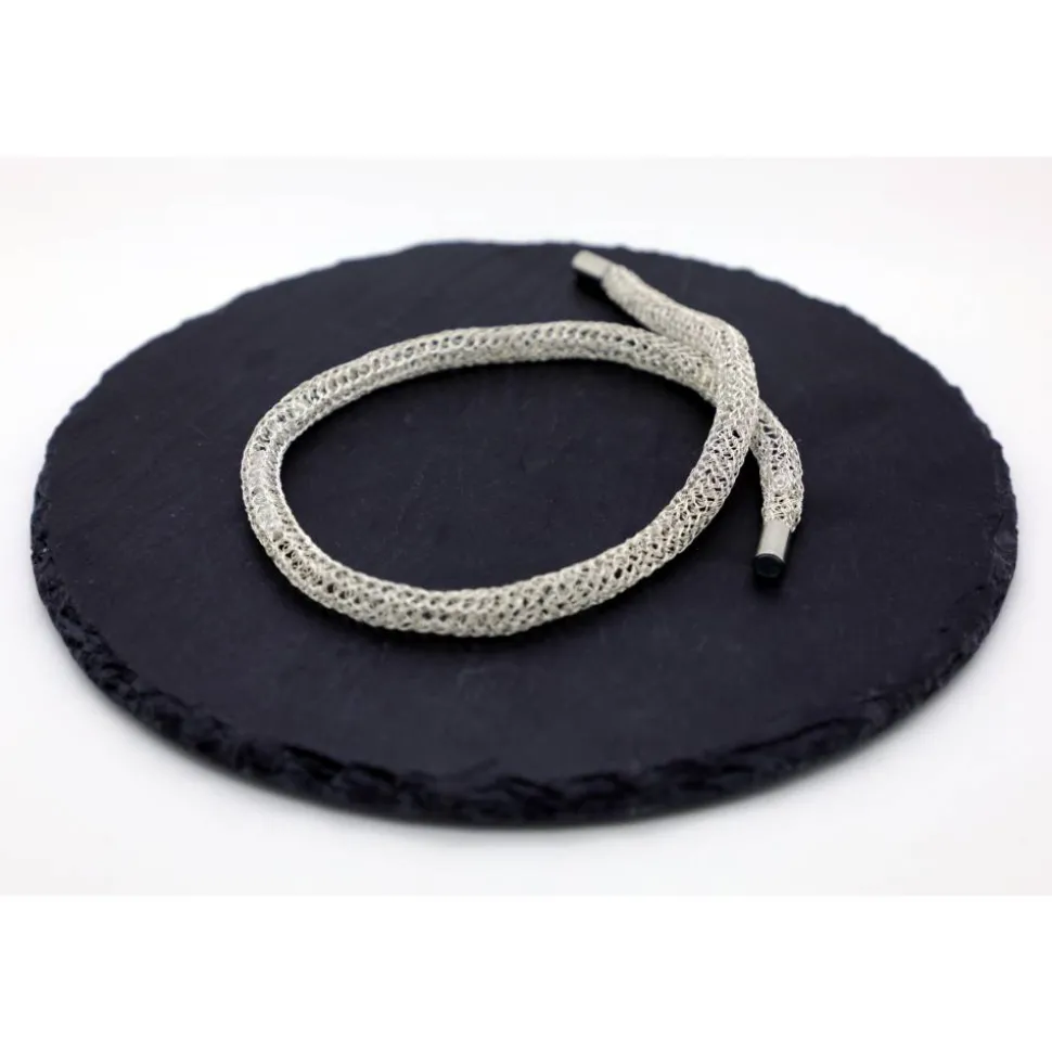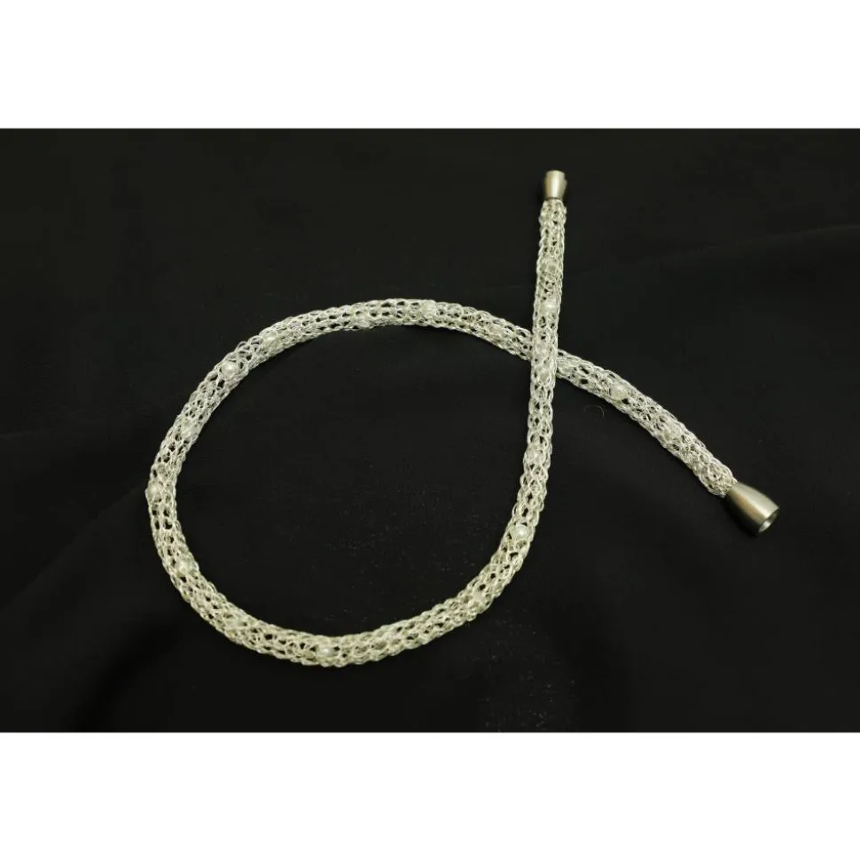 Dieses Collier aus zartem lackiertem Silberdraht verleiht jeder Trägerin einen ganz eigenen Charme und ihrem Look Leichtigkeit. Eyecatcher sind die über die gesamte Länge eingearbeiteten kleinen weißen Wachsperlen. Gerade auf einem dunklen Untergrund kommt der Schmuck besonderes zur Geltung. Romantisch und elegant zum Beispiel als Geschenk zum Valentinstag.