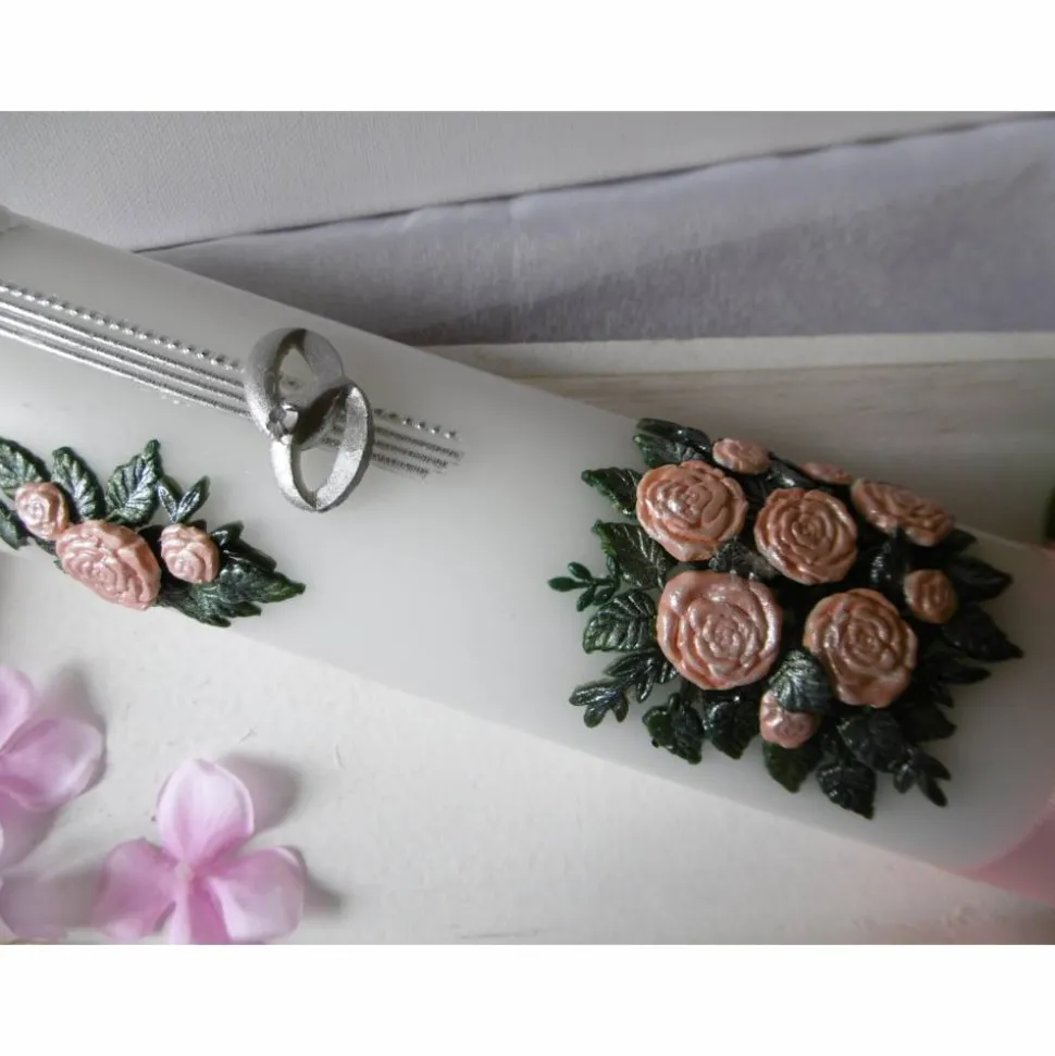 Die abgebildete Hochzeitskerze ist von uns in Vollwachsauflage mit einem ansprechenden Rosenbouquet gestaltet worden.