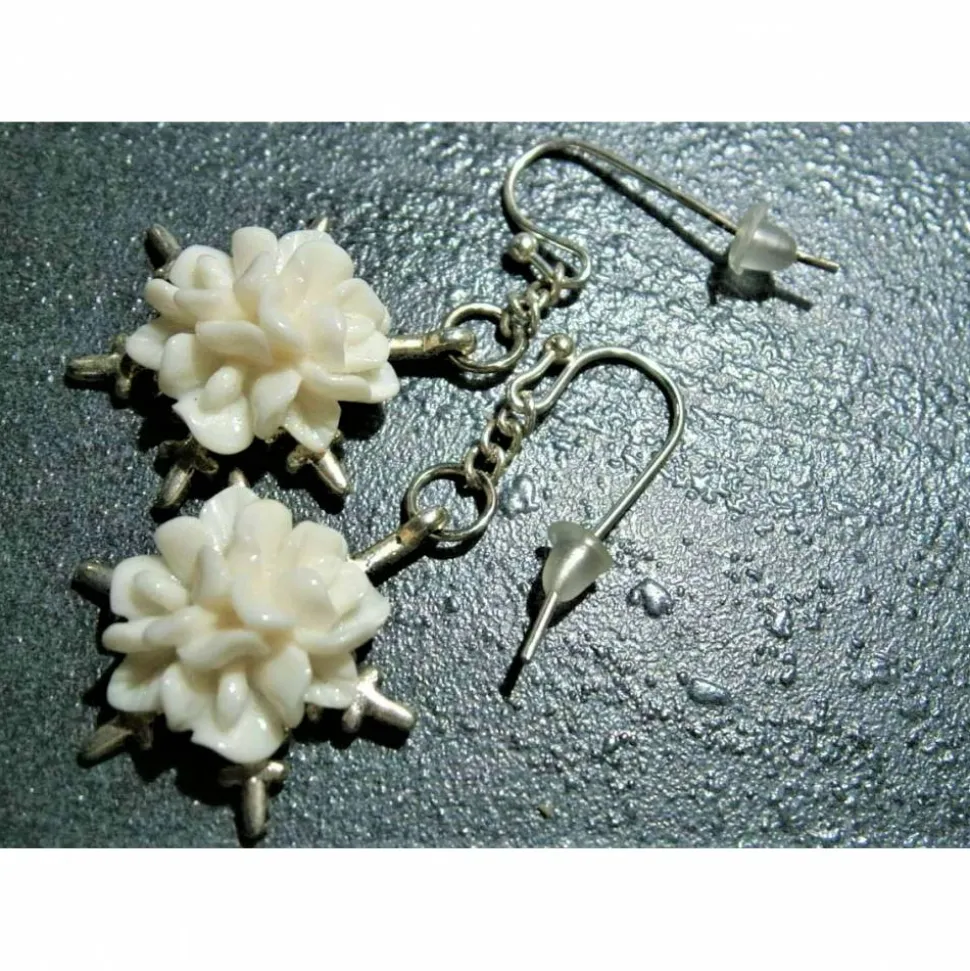 Größe der Blüten etwa 15 Millimeter, Länge der Ohrringe komplett mit der silberfarbenen Hakenbrisur 40 Millimeter.