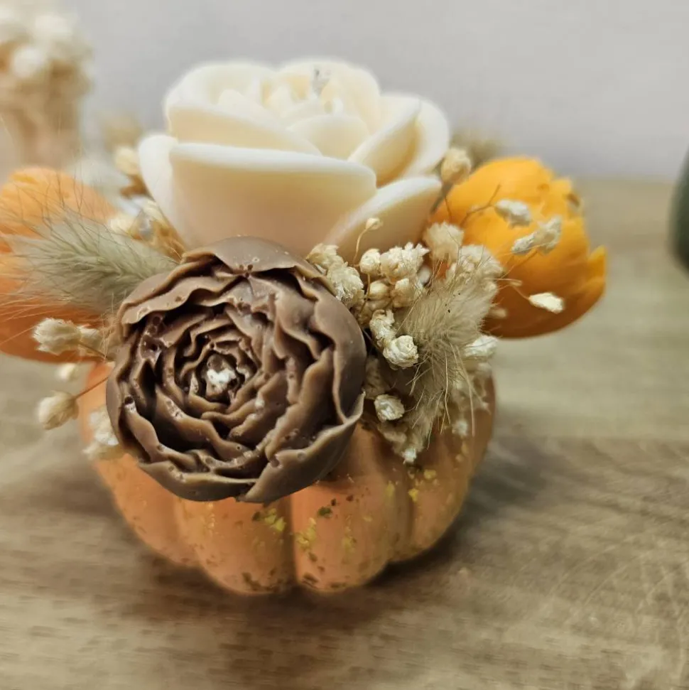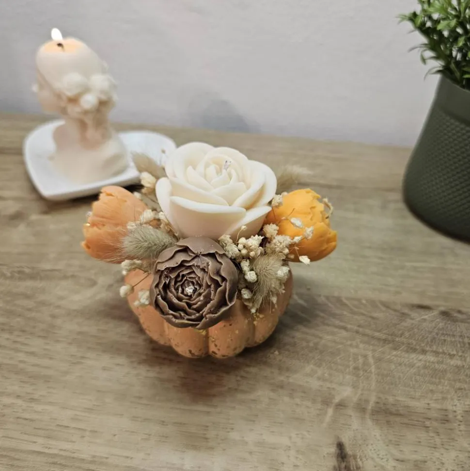 Ich präsentiere eine wunderschöne Komposition mit einer zentralen, cremeweißen Rosenkerze und weiteren Blumen- und Mohnkapsel-Kerzen in warmen Braun- und Orangetönen. Das Arrangement wird durch zarte Trockenblumen ergänzt und stilvoll in einem klassischen orangen Kürbis-Teelichthalter präsentiert.