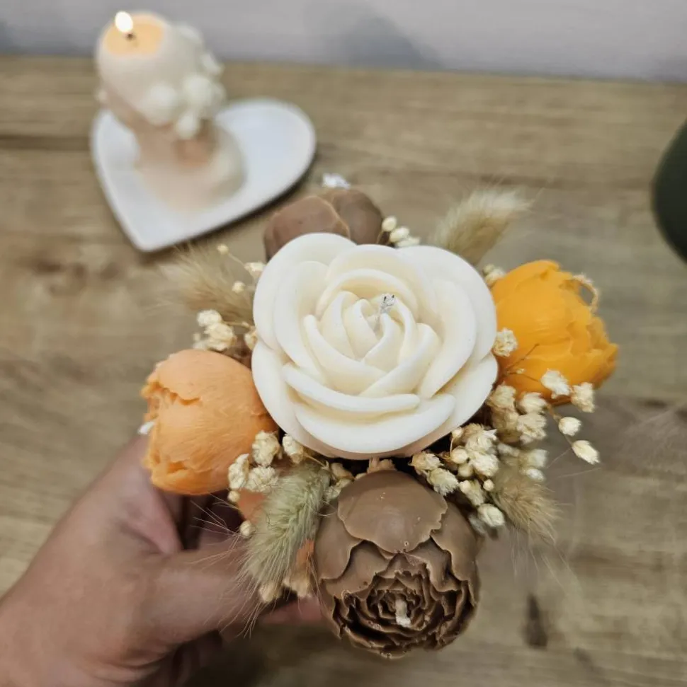 Dieses handgefertigte Kerzenblumen-Arrangement ist eine Fusion aus klassischer Eleganz und gemütlicher Herbststimmung. Es ist das perfekte, romantische Statement-Piece für Ihr Zuhause oder ein einzigartiges Geschenk, das bleibende Freude schenkt.